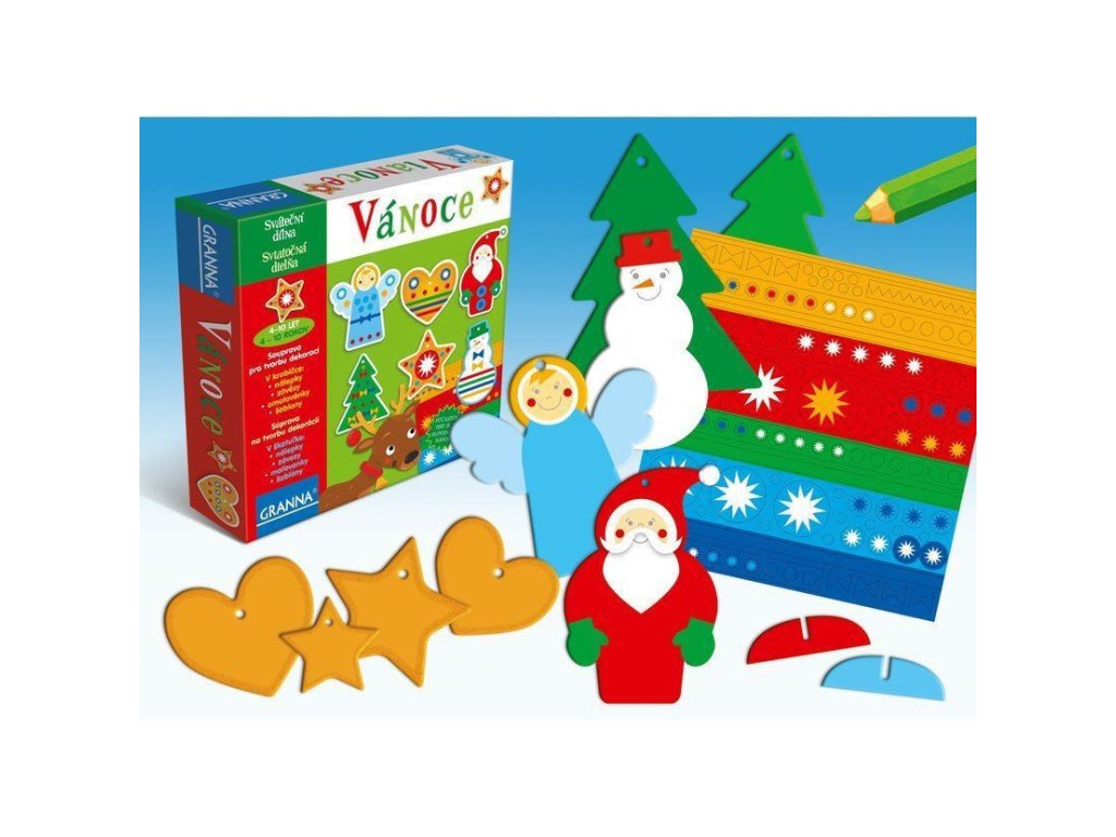 Tematicky zaměřená kreativní souprava, díky které si děti mohou vytvořit nádherné dekorativní vánoční ozdoby. Mikulášové, sněhuláci, andílci, perníčky a stromečky v několika velikostech čekají na čtyřech arších ze silného, pevného kartonu. Z jedné strany jsou tyto motivy barevné a k jejich ozdobení slouží přiložený aršík barevných nálepek různých tvarů. Z druhé strany jsou všechny tvary bílé a poskytují dětem prostor pro tvořivou práci s pastelkami, fixy apod., a to jak podle přiložených vzorů, tak na základě vlastní fantazie.