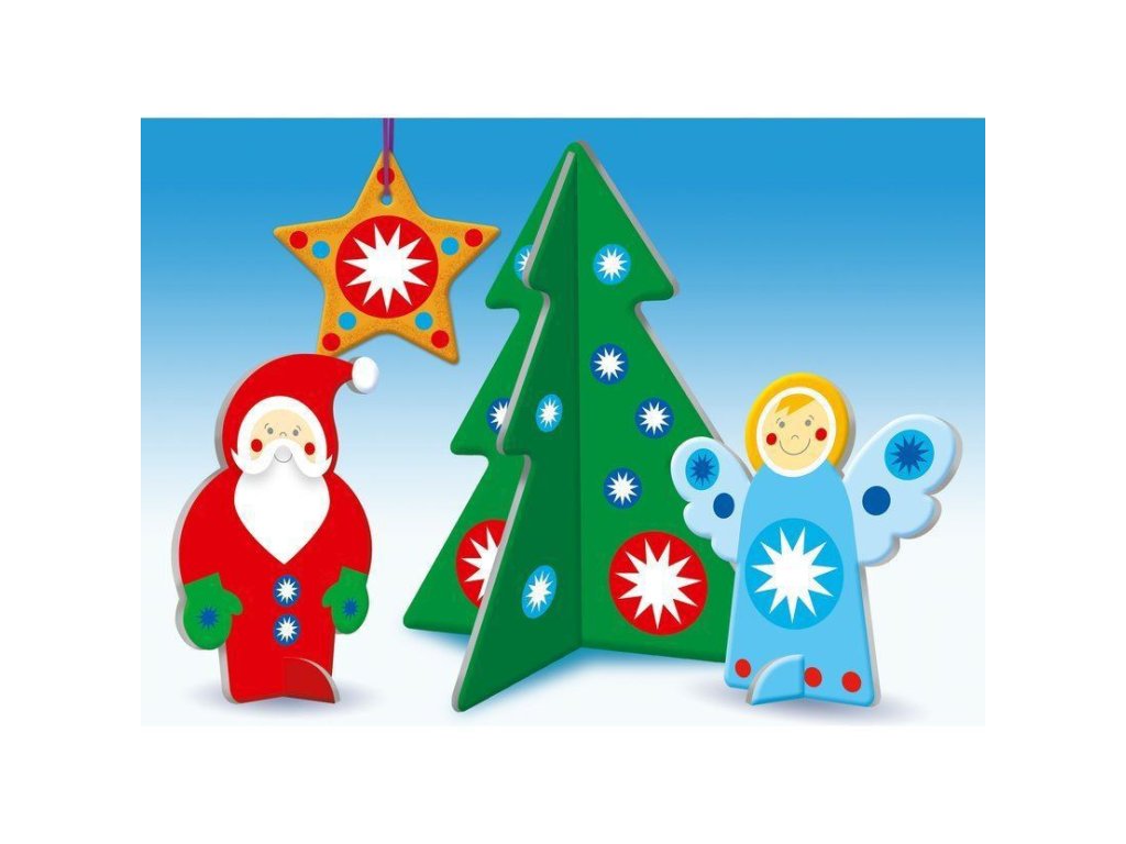 Obsah balení: 1 velký stromeček k postavení 2 menší stromečky k zavěšení 3 větší figurky (Mikuláš, andílek a sněhulák) do stojánku 6 figurek ve dvou velikostech (2 Mikulášové, 2 andílci a 2 sněhuláci) k zavěšení 6 perníčků ve třech velikostech (3 srdíčka a 3 hvězdičky) k zavěšení 3 stojánky 4 archy šablon (vzniknou po vytlačení jednotlivých motivů) 1 aršík s barevnými samolepkami