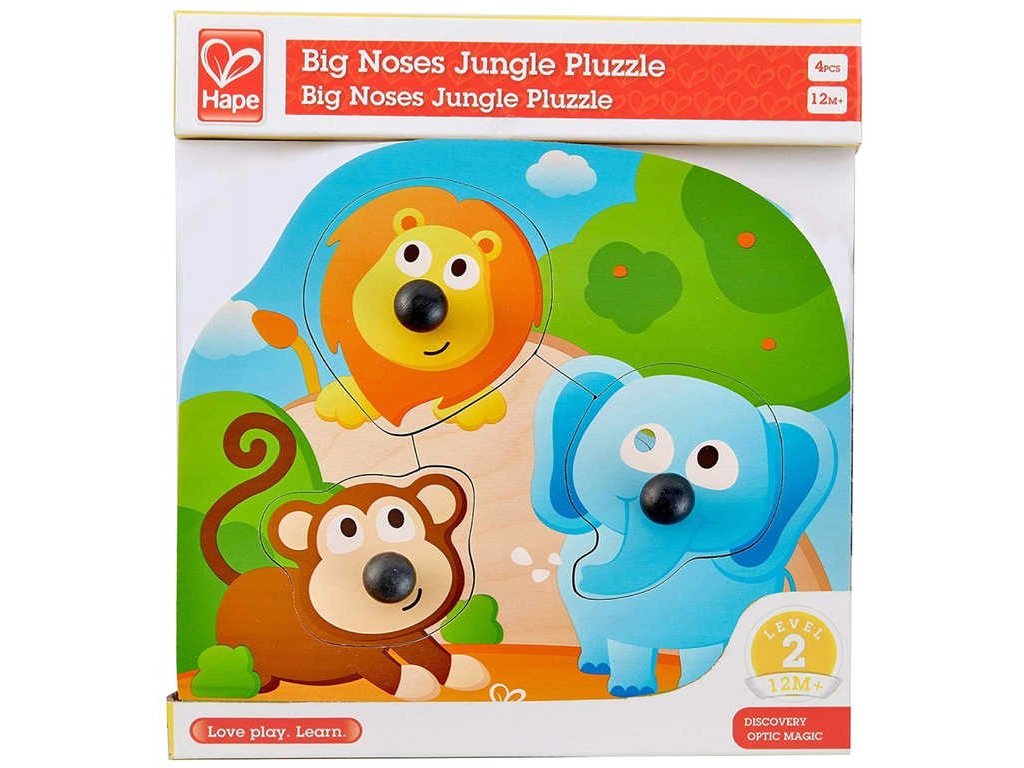 HAPE DŘEVO Baby puzzle vkládací s úchyty zvířátka džungle 3 dílky na desce