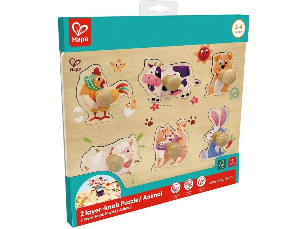 S tímto dřevěným puzzle farma od Hape mohou děti hravou formou objevovat život na farmě. Barevné puzzle má dvě vrstvy a pevné dílky s velkými dřevěnými úchyty, takže ho malé ručičky snadno uchopí. Procvičování jemné motoriky a koordinace ruka-oko se stane veselým dobrodružstvím. Každý dílek skládačky skrývá pod sebou překvapivý obrázek, což dodává zábavě ještě větší vzrušení. Děti se při hraní učí rozpoznávat hospodářská zvířata, napodobovat jejich zvuky a rozšiřovat si slovní zásobu. Vyrobeno z odolného dřeva s barvou vhodnou pro děti.
