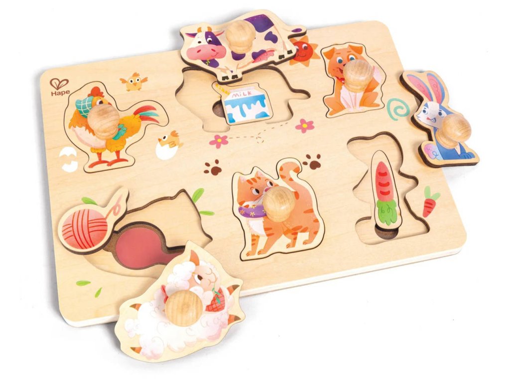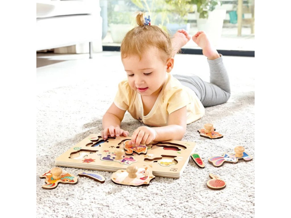 HAPE DŘEVO Puzzle baby vkládací Farma s úchyty 12 dílků na desce