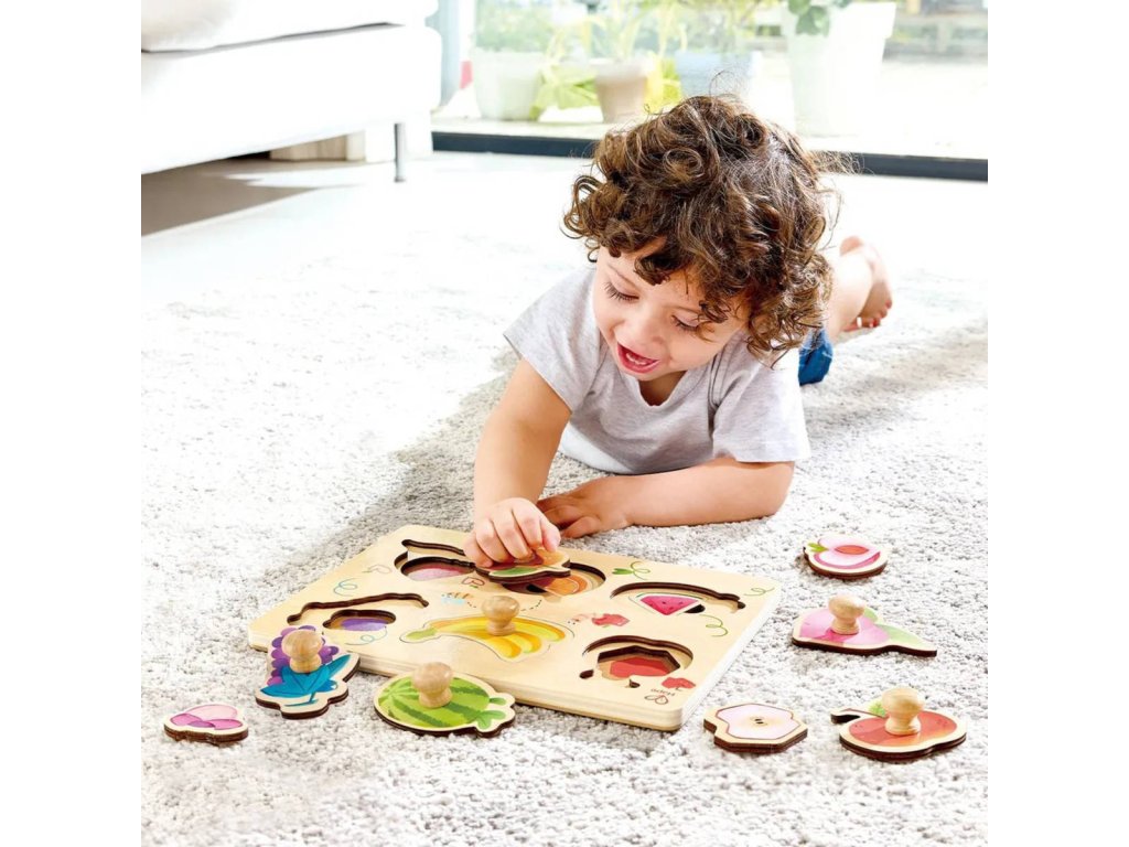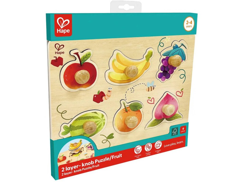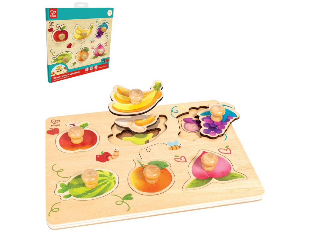 S veselým dřevěným puzzle Hape Fruity Layer objeví vaše batole hravou formou všechny druhy ovoce. Puzzle má dvě vrstvy, což nabízí dvojnásobnou zábavu a pokaždé nové překvapení. Pevné dřevo a barevné ilustrace ho činí pro malé ručičky ještě atraktivnějším. Puzzle Fruity Layer stimuluje jemnou motoriku, koordinaci rukou a očí a schopnost řešit problémy. Díky úchytům mohou malé děti dílky snadno uchopit a umístit. Tímto způsobem se učí rozpoznávat tvary a seznamují se s názvy a barvami ovoce.