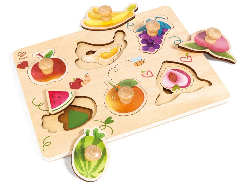 HAPE DŘEVO Puzzle baby vkládací Ovoce s úchyty 12 dílků na desce