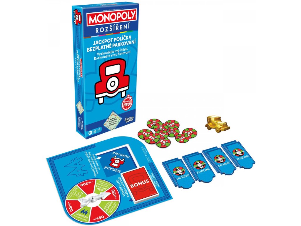 Rozšíření hry Monopoly Classic. Zkuste své štěstí a získejte hromadu peněz! Rozšíření Jackpot políčka Bezplatné parkování pro hru Monopoly přináší do klasické hry zábavné zpestření a hru Monopoly s ním dohrajete dvakrát rychleji. Stačí toto rozšíření připojit ke klasické desce Monopoly a proměnit políčko Bezplatné parkování v jackpot. V tomto zábavném rozšíření rodinné hry se políčka Šance a Pokladna promění v políčka Zatočení. Hráči, kteří na ně vstoupí, mohou roztočit spinner a hrát o jackpot. Spinner a karty Bonus umožňují šťastným hráčům získat figurku Zlatý vůz. Kdo jím jede, může získat nemovitosti zdarma a vyhnout se placení nájemného. Tahejte karty Bonus bezplatného parkování a získejte nejrůznější štědré bonusy – například nemovitosti a domy zdarma, hotovost a další.