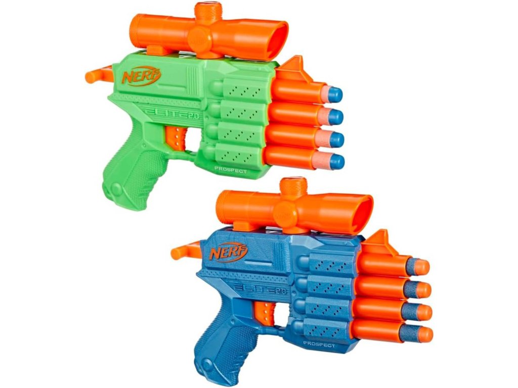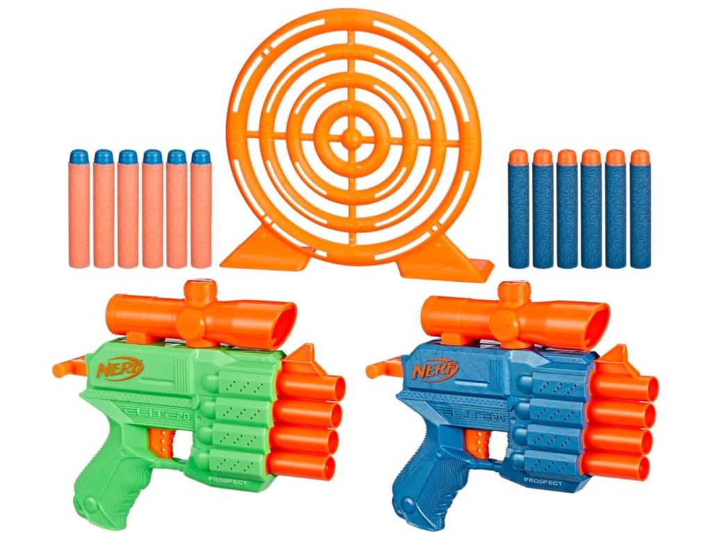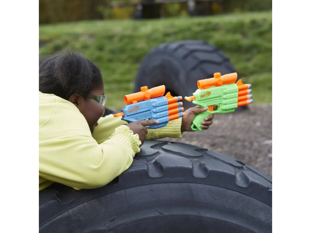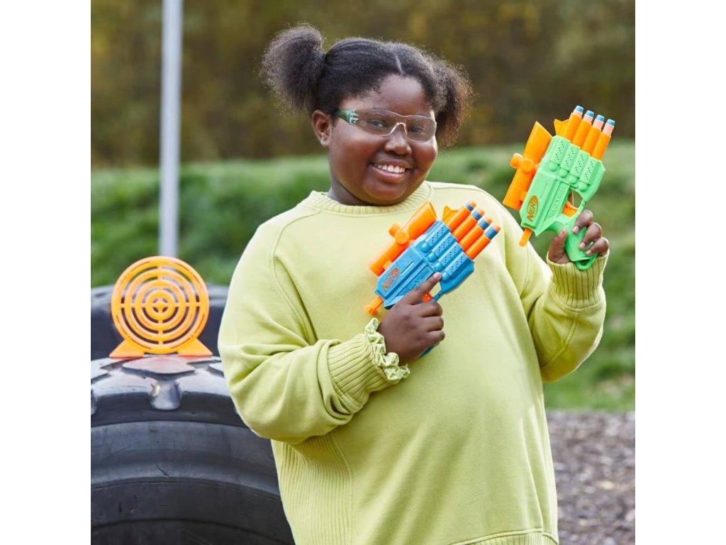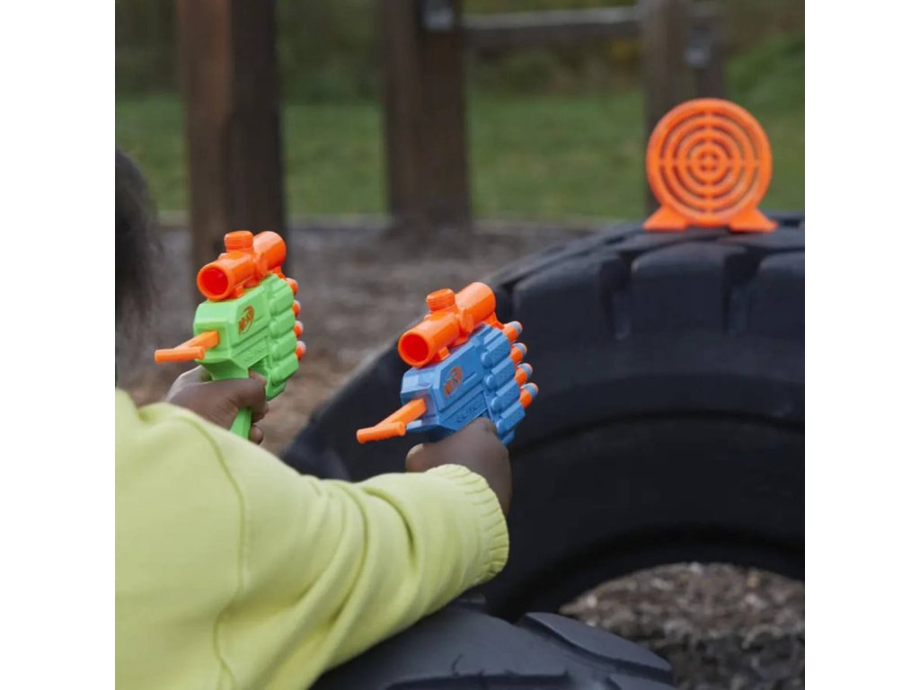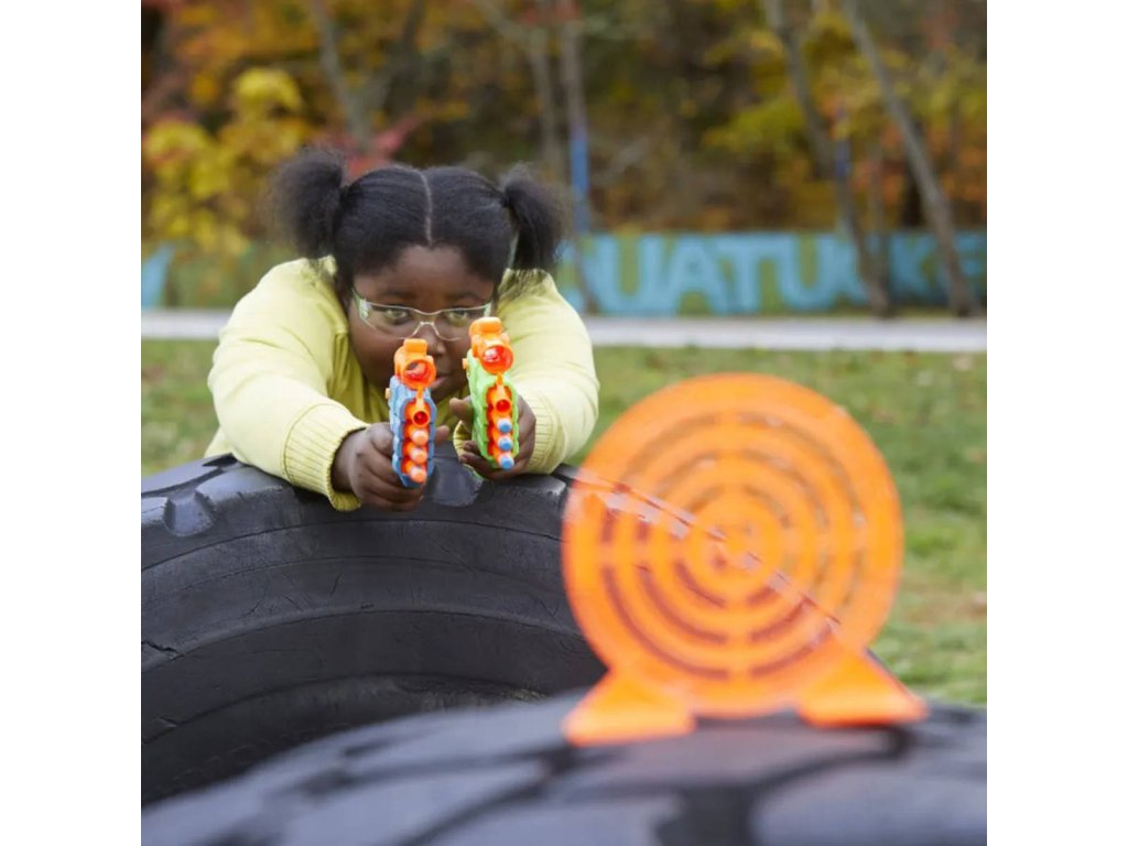 Pusťte se do venkovních her pro děti se sadou Nerf Face Off Target Set, která obsahuje 2 blastery Prospect QS-4, terč a šipky Nerf Elite Zasáhněte cíl a získejte body v soutěžních výzvách. Vložte 4 šipky, stáhněte dolů nabíjecí rukojeť a stiskněte spoušť pro vypuštění 1 šipky. Každý blaster vystřelí 4 šipky v řadě, má zaměřovací dalekohled pro míření, zatahovací rukojeť a obsahuje 12 šipek Nerf Elite.