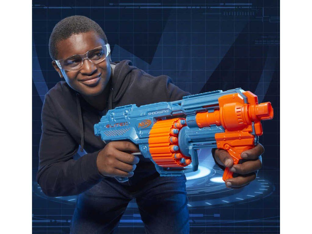 Bojujte novou pistolí NERF 2.0 Shockwave! Tato nová pistole Elite 2.0 má rotační bubínek, který pojme 15 šipek. Zamiřte a vystřelte 1 šipku nebo rychle vystřelte všech 15 šipek šipek v rychlém sledu. Tato akční