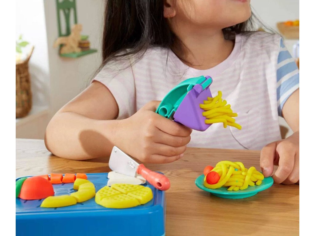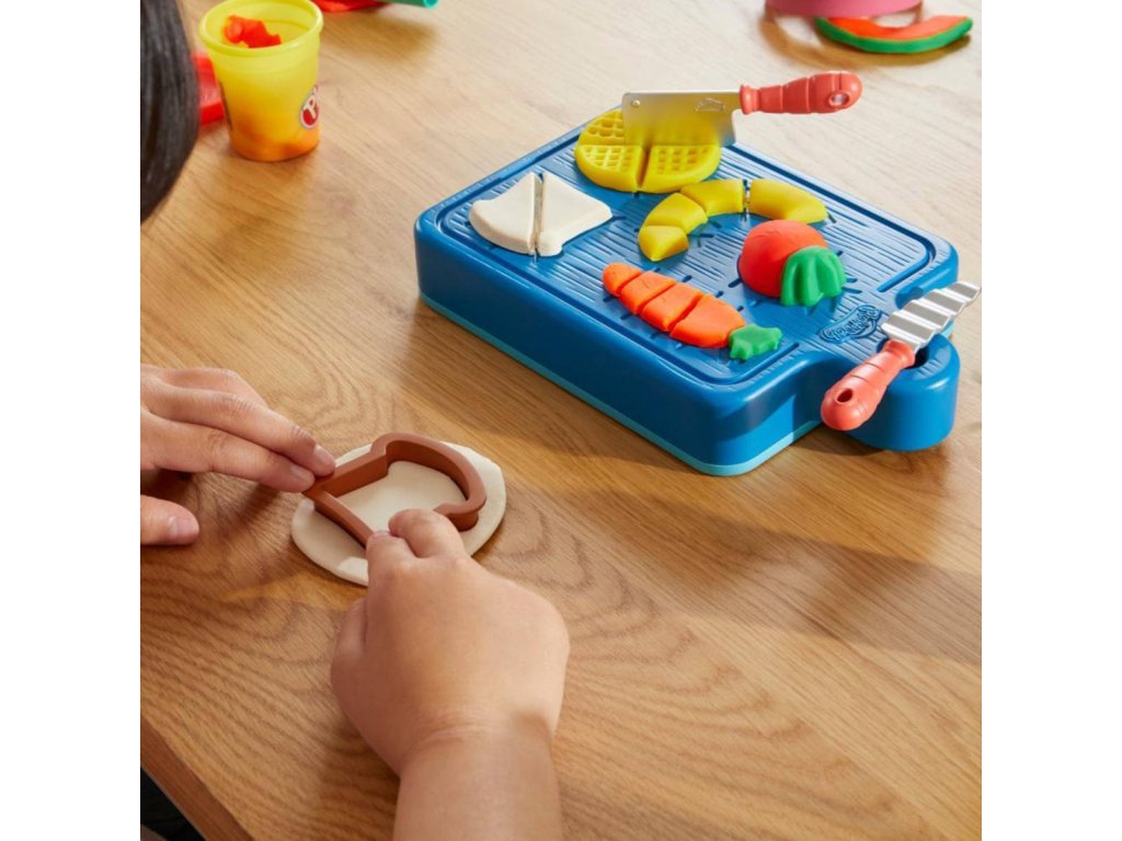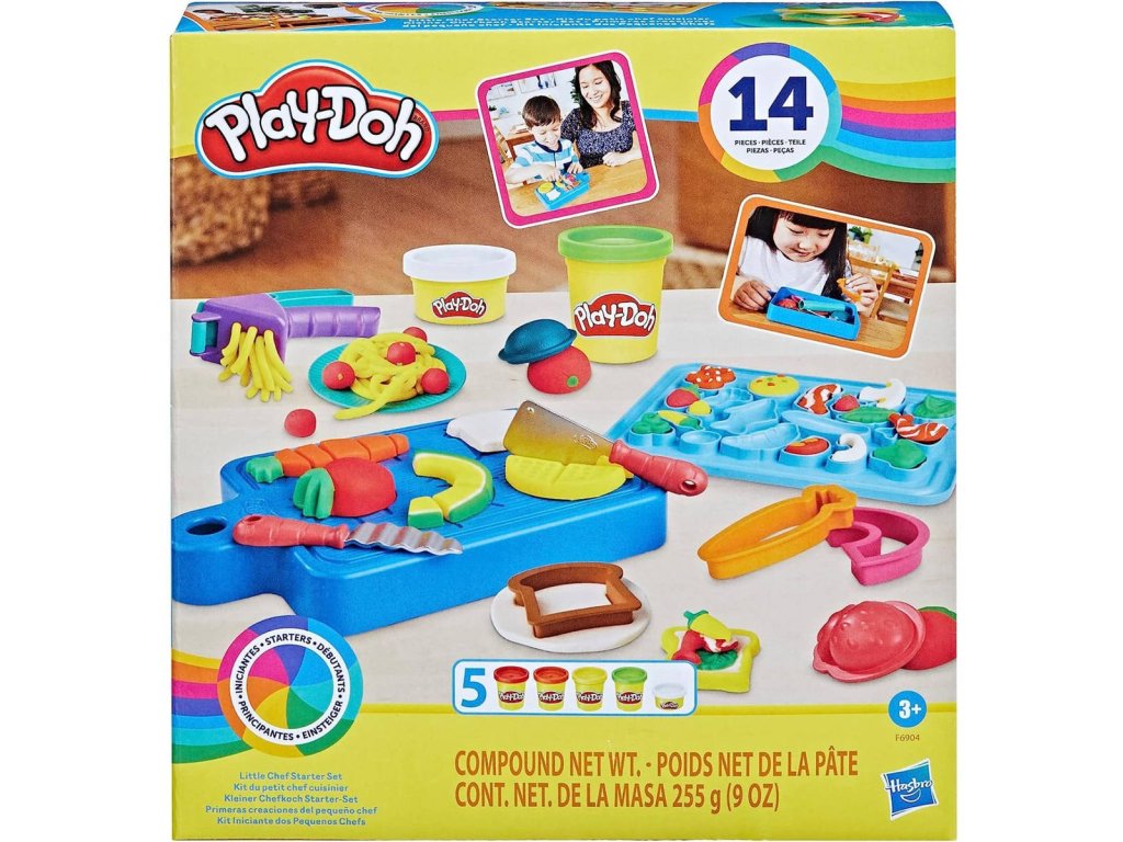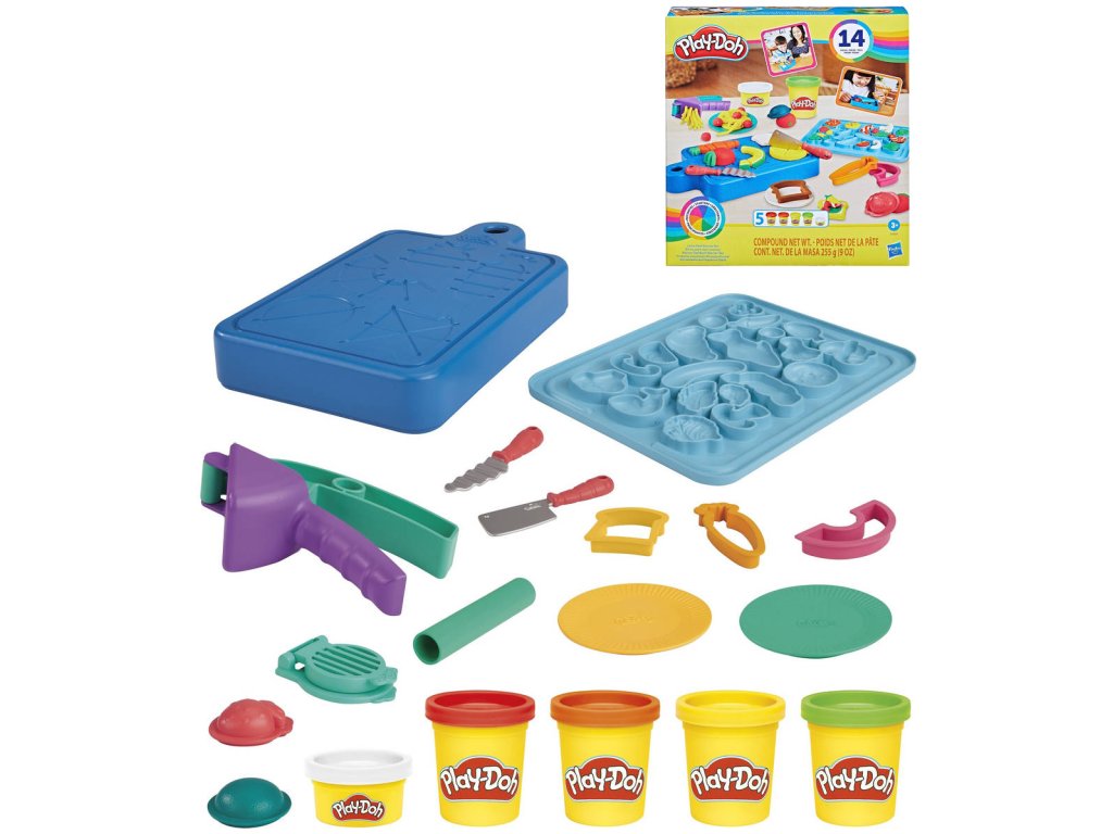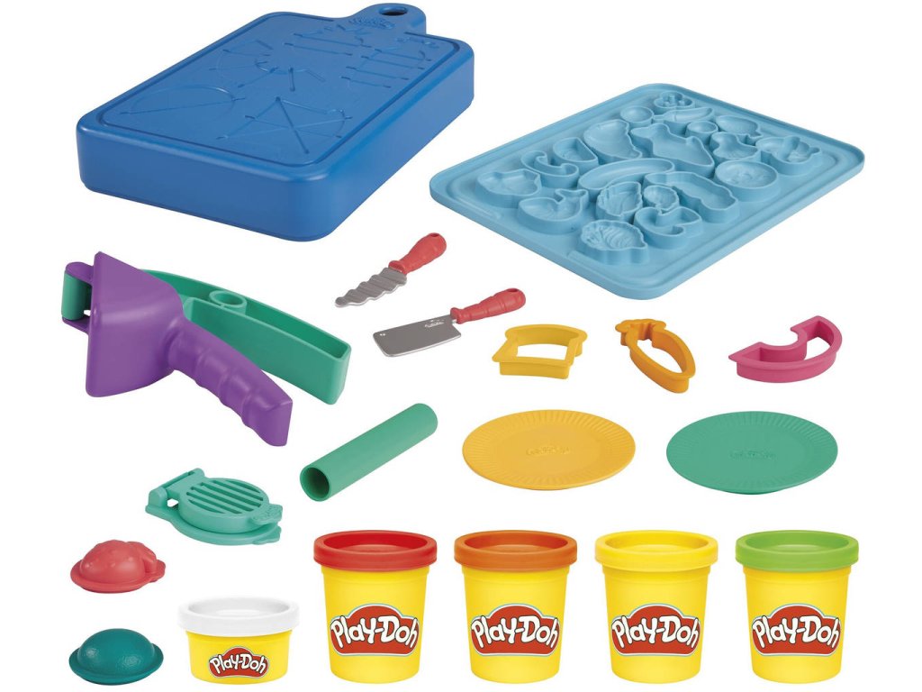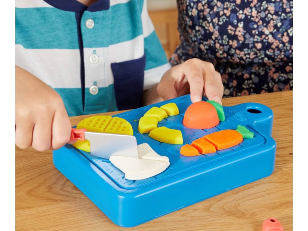 Pusťte se do vaření! Herní sada pro nejmenší na kuchařské výtvory Play-Doh Malý kuchař je přímo stvořená pro začínající kuchaře a obsahuje 14 kuchyňských náčiní a Play-Doh v 5 barvách. Děti mohou pomocí formiček a vykrajovátek tvořit hravé jídlo různých tvarů. Pak ho stačí položit na některou ze šablon na krájecím prkýnku, nakrájet a nasekat připravenými dětskými hracími noži! Děti si zamilují náčiní jako je lis na česnek nebo kráječ na vejce. A navíc na spodní straně krájecího prkénka na ně čeká spoustu dalších forem! Tato herní kuchařská sada obsahuje i malé nádobí, aby děti mohly své výtvory náležitě hrdě prezentovat. Ať už se jedná o první sadu na seznámí se s Play-Doh či dárek pro děti starší 3 let, objeví díky ní radost z hraní s Play-Doh.