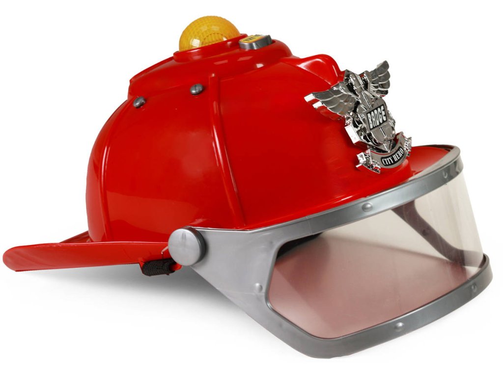 Plastová hasičská dětská helma, červená přilba s ochranným krytem, na hlavu, na baterie, se světlem a zvukem. Malý hasič.