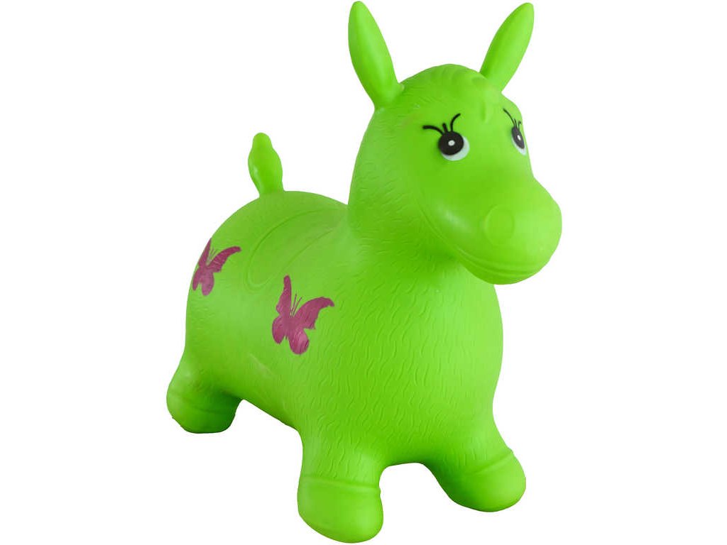 Gumové zelené nafukovací skákadlo pro děti, ve tvaru poníka z gumy, s motýlky, baleno ve vyfouknutém stavu v sáčku.