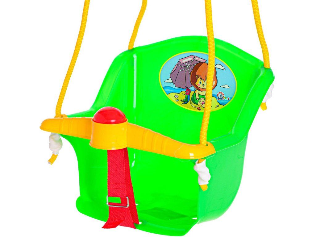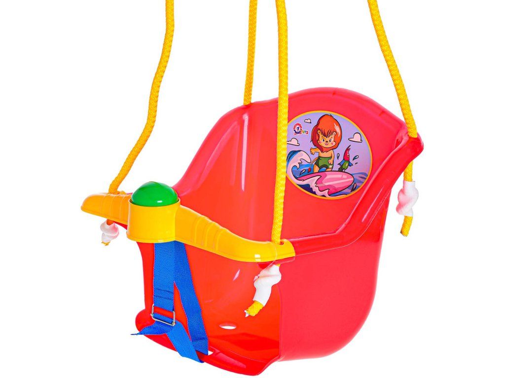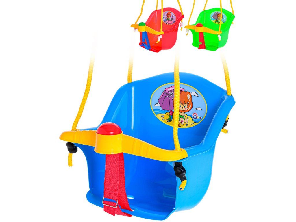 Bezpečná plastová závěsná houpačka (skořepina) pro nejmenší děti, s obrázkem. Součástí bezpečností popruh a zábrana. Velikost 35 x 38 x 34cm, 3 barevné varianty, max. nosnost 20kg.