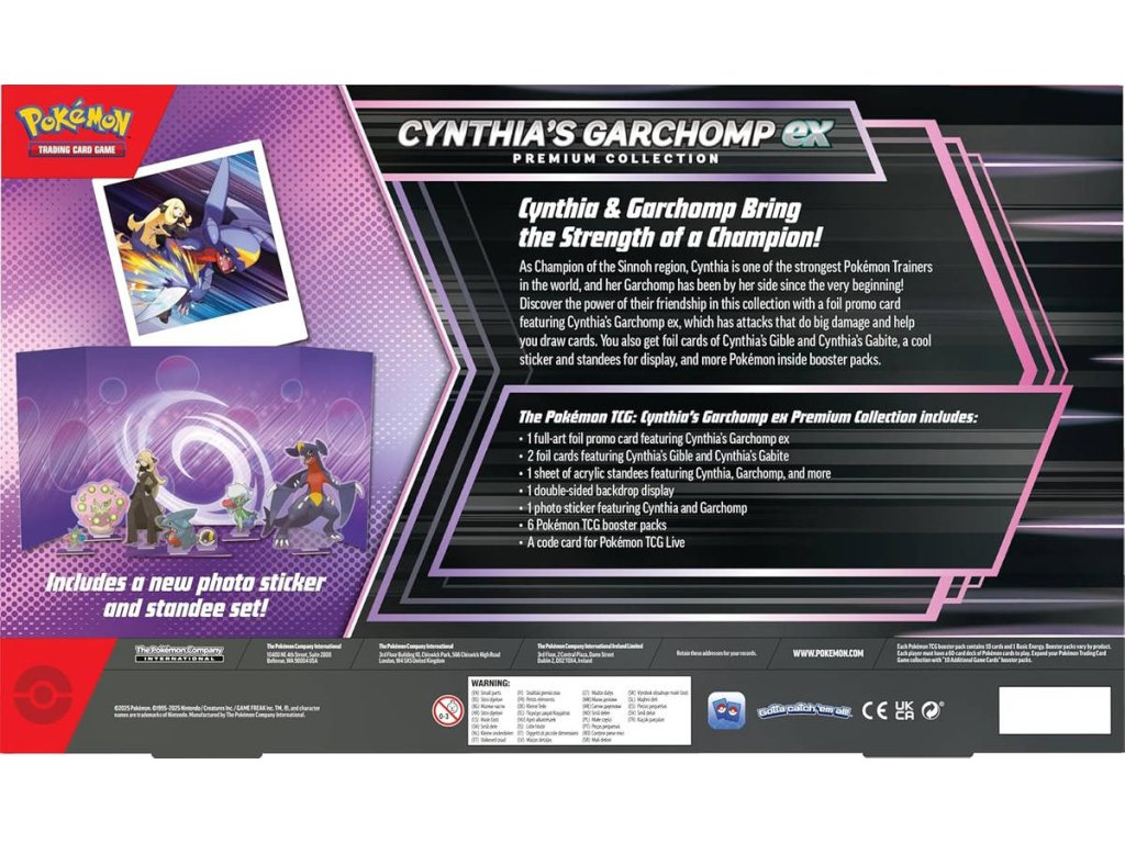 Pokémon Cynthia’s Garchomp ex Premium Collection je dárkové balení 6 balíčků Pokémonů, 3 promo karet, akrylových postaviček a nálepky. Jedná se o skvělý dárek a udělá radost každému sběrateli.