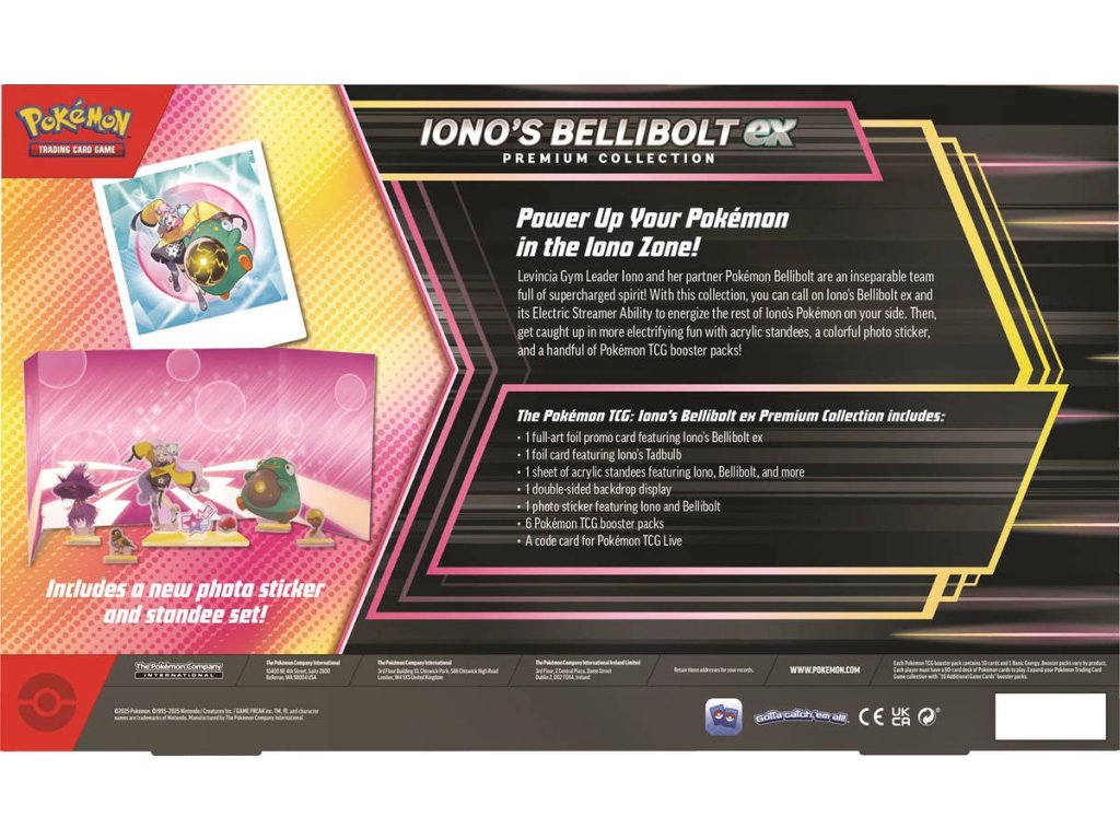 Levincia Gym Leader Iono a její parťák Bellibolt tvoří nerozlučnou dvojici! V tomto speciálním boxu najdete vše, co potřebujete. Kromě herních karet vás čekají i stylové akrylové stojánky, barevné fotografické samolepky a několik booster balíčků Pokémon TCG. Novinkou v tomto balení je akrylová deska, z které se vylámou postavičky a stojánky a můžete si udělat zátiší s Iono a Bellibotem. Tento typ doplňku je úplnou novinkou a ještě nebyl nikdy podobný box vyroben. Iono je energická a charismatická Gym Leaderka z města Levincia v oblasti Paldea. Kromě toho, že vede Elektrický stadion, je také slavnou streamerkou a influencerkou, která miluje světla reflektorů. Navzdory svému extravagantnímu chování je velmi schopnou trenérkou, která dobře rozumí taktice a využívá schopnosti svých Pokémonů naplno – a její nejvěrnější parťák Bellibolt je toho důkazem. Bellibolt je Pokémon typu Electric, který svým kulatým tělem a přátelským výrazem klame! Jeho elektrické útoky z něj dělají velmi nebezpečného protivníka.