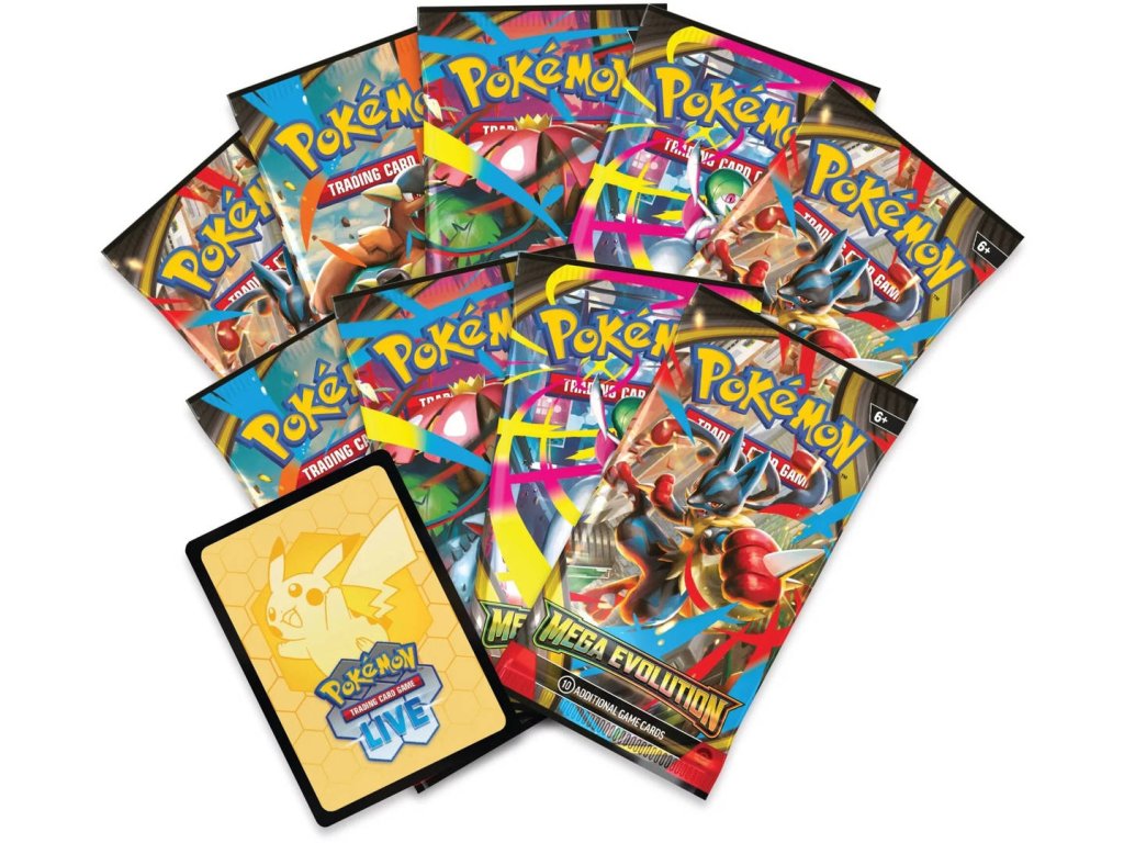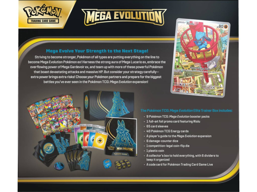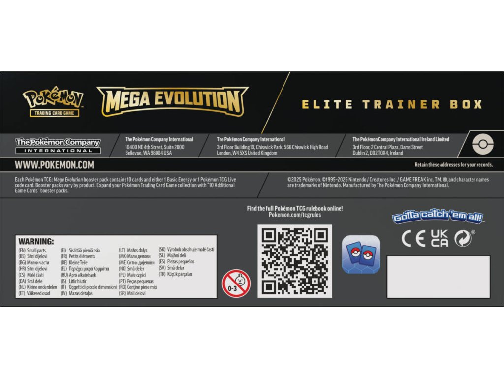 Elite Trainer Box Mega Evolution je balení 9 balíčků Pokémon karet, 1 promo karty, 65 obalů, 6 kostek a oddělovačů. Každý balíček obsahuje 10 karet. Celkově tak získáte 90 Pokémon karet.