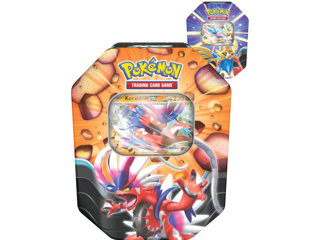 Hra Pokémon TCG Slashing Legends Tin, součástí 4x booster (4x 10 náhodných karet) + foilová promo karta, v kovovém boxu, 2 varianty provedení (Koraidon Ex / Zacian Ex).