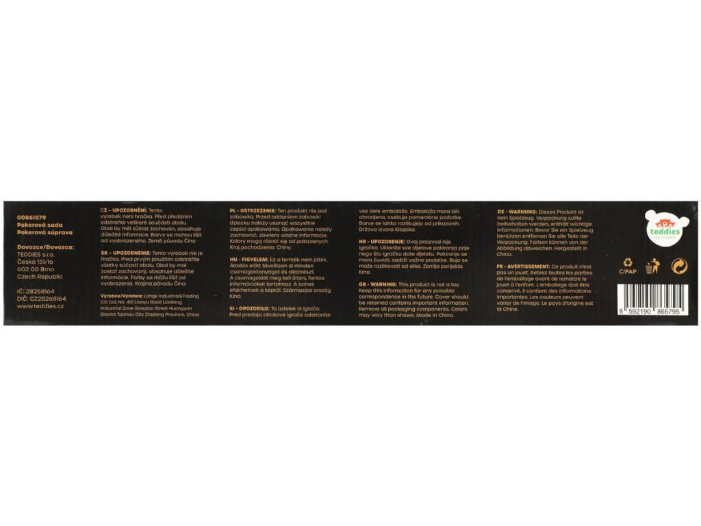 Obsah balení: žetony (300ks, průměr 30mm, hmotnost 11,5g), 2 balíčky karet, 5 hracích kostek