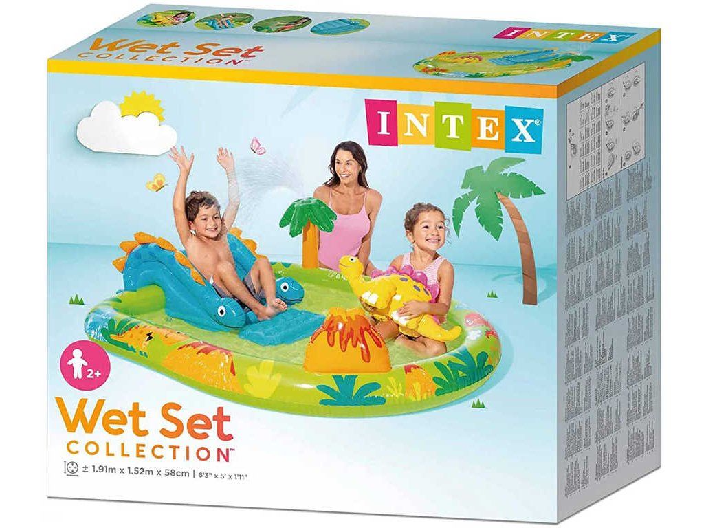 Nafukovací centrum v designu dinosaura o velikosti 1,91 m x 1,52 m x 58 cm. Hubice na vodní rozstřikovač. Výrobek obsahuje skluzavku a další herní prvky. Součástí výrobku je také jedna nafukovací podložka navíc. Vypouštěcí zátka ve dně bazénu. Kapacita bazénku je 143 litrů a výška stěny je 12 cm. Maximální nosnost je 54 kg. Součástí balení je opravná záplata.