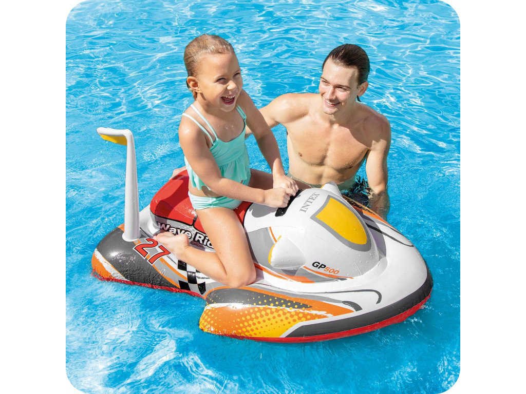 Nafukovací skútr Wave Rider Ride-On od firmy Intex je hračka do vody s výrazným designem. Je vyroben z 0,25mm vinylu a vhodný pro děti od tří let. Stabilitu a bezpečnost zvyšuje široká základna a