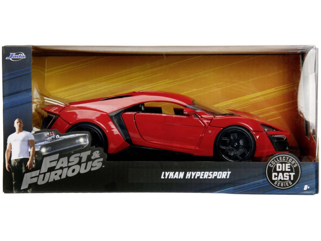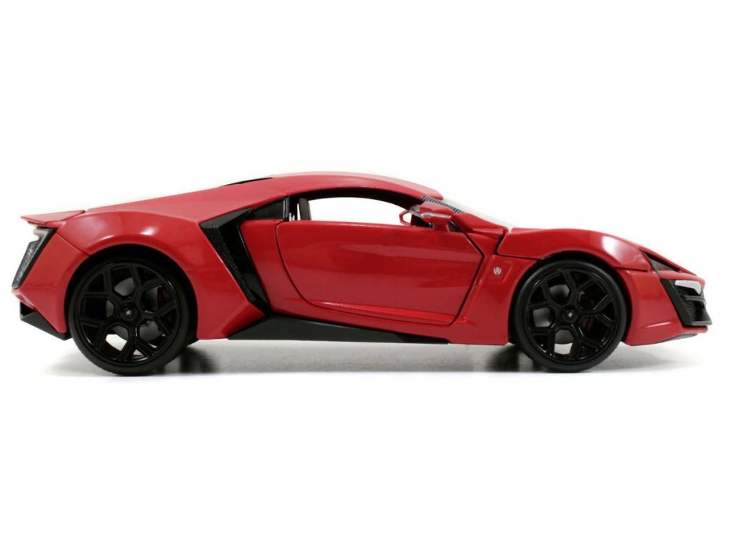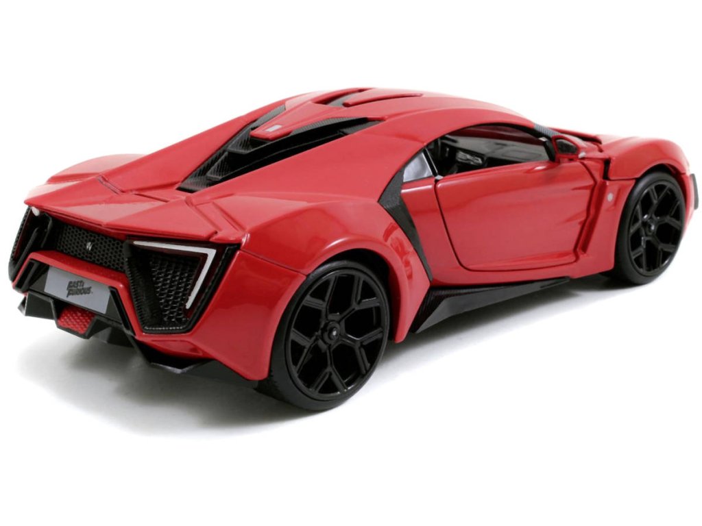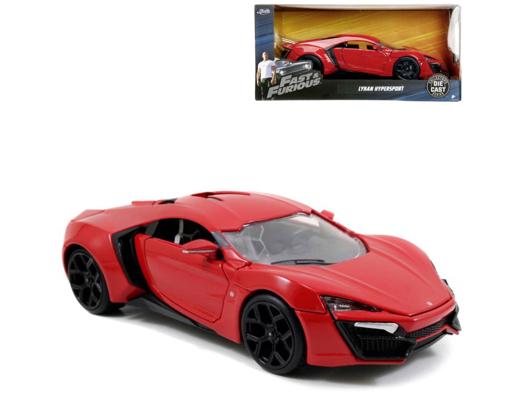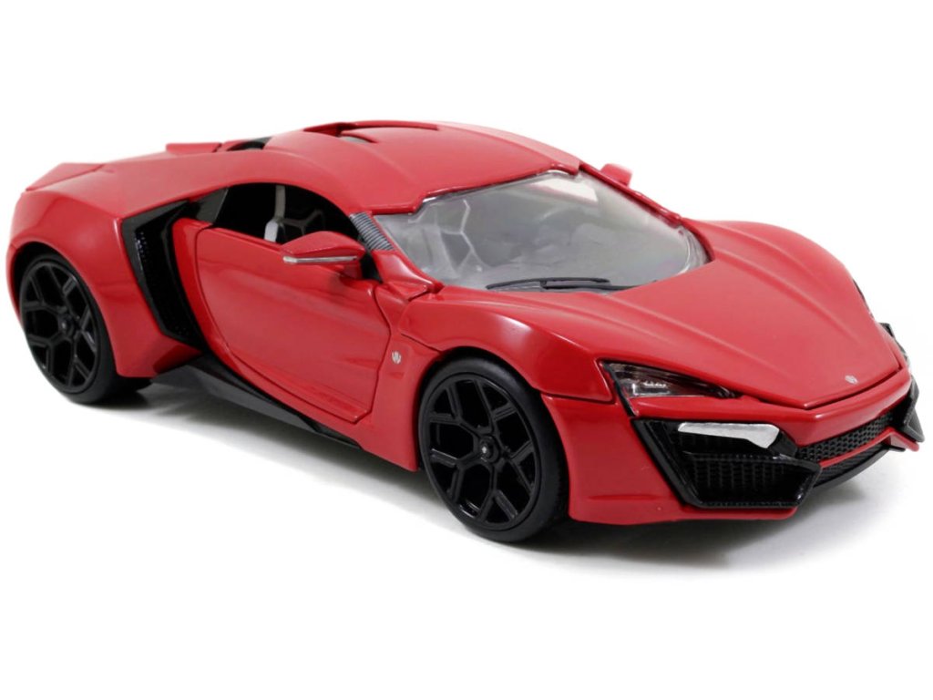 Kovový model auta Lykan Hyperspot v měřítku 1:24 z filmu Rychle a zběsile. Na volnoběh, otevírací dveře, kufr a kapota. Velikost 19 cm.