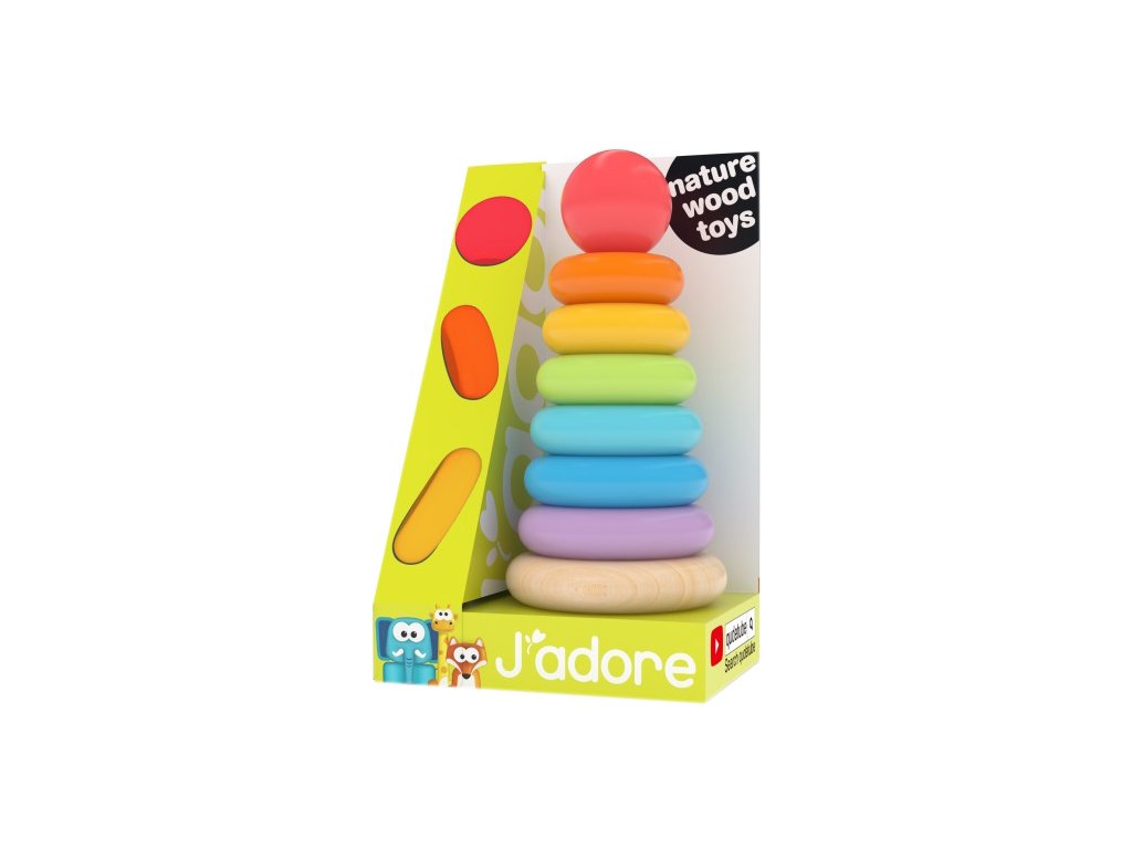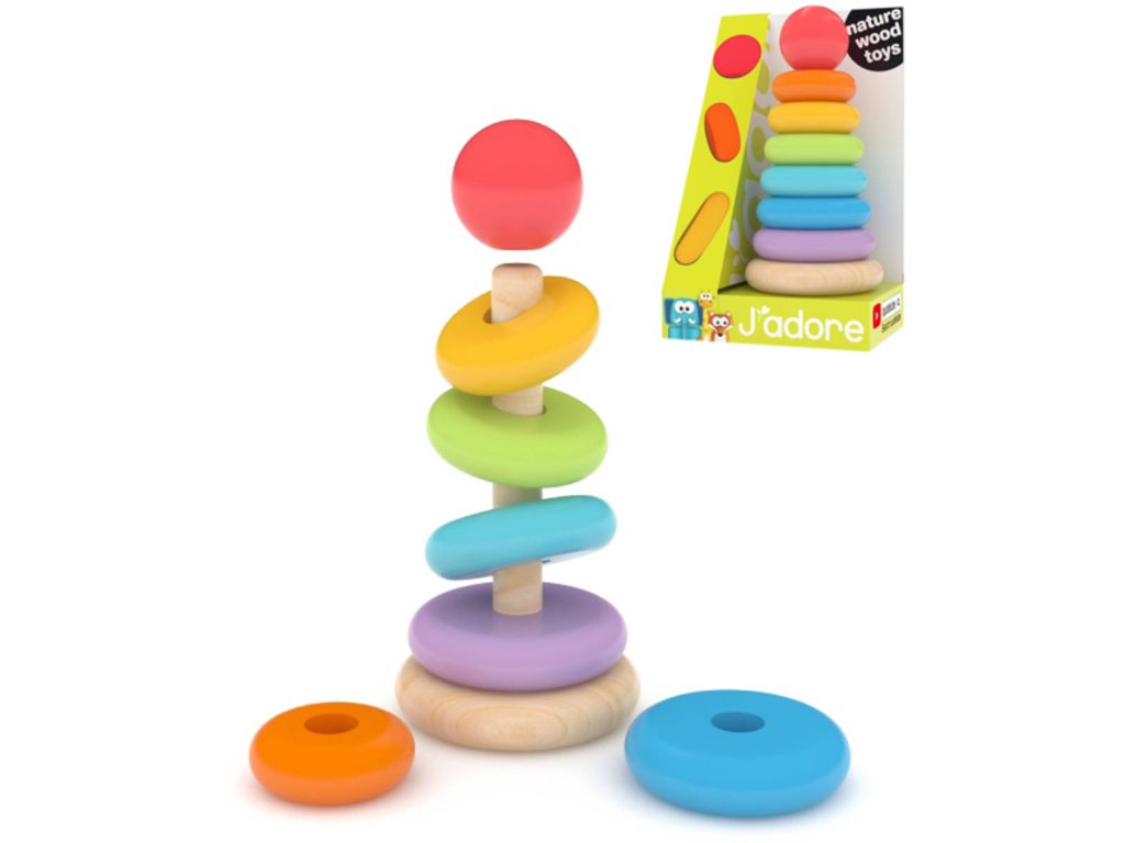 JADORE DŘEVO Baby pyramida navlékací věžička duhové kroužky