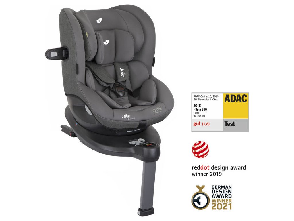 Značka Joie pochází z Anglie. Byla založena v roce 2011. V tuto chvíli patří mezi nejprodávanější značky ve Velké Británii a nabízí své produkty ve více než 100 zemích světa. I přes krátkou dobu její působnosti na světovém trhu se podařilo jejím produktům získat řadu uznávaných ocenění, například za bezpečnost, praktičnost a design. autosedačka i-Spin 360™ Nástupce autosedačky Spin 360™ zachovává výhodu malé náročnosti na prostor ve vozidle. Nyní s výsuvnými prvky boční ochrany Guard Surround Safety™ a systémem Safe Rotation Guard™ a větším prostorem pro nohy dítěte. Ještě bezpečnější - I-Spin 360™ přesahuje bezpečnostní nároky normy i-Size a přidává vylepšenou ochranu proti bočnímu nárazu a znesnadňující otočení po směru jízdy příliš brzy. Snadné ovládání - Autosedačku i-Spin 360™ můžete po stisknutí tlačítka otáčet jednou rukou. Pro usnadnění nastupování dítěte tak můžete autosedačku natočit směrem do dveří automobilu. Unikátní konstrukce - Na rozdíl od ostatních autosedaček poutaných proti směru jízdy, je i-Spin 360™ navržena tak, že její tvar eliminuje nutnost použití přední vzpěry. Díky tomu zabere ve vozidle méně místa a je tedy vhodná i do menších vozidel. Cycle™ - látkové části této kolekce, označené barvou shell gray, jsou vyrobené z recyklovaných PET lahví, čímž je sníženo množství plastového odpadu v oceánu. Použití PET lahví nemá žádný vliv na kvalitu materiálu, který je i nadále testován na přítomnost více než 150 chemických látek. Potah autosedačky i-Spin 360™ shell gray je vyroben ze 33 recyklovaných PET lahví. klíčové vlastnosti: •autosedačka schválená dle ECE R129/02 (i-Size) •schválená pro použití proti směru jízdy od narození do výšky 105 cm •schválení pro použití po směru jízdy od věku 15 měsíců (min 76 cm výšky) do výšky 105 cm •Smart Ride™ pojistka znesnadňuje možnost otočení po směru jízdy před tím, než je možné používat ji po směru (minimální věk 15 měsíců a výška nad 76 cm). Doporučeno je používat sedačku proti směru jízdy co nejdéle •otočná v rozsahu 360 stupňů, výrazně usnadňuje nastupování a vystupování dítěte •Simple Swivel™ - aktivátor otáčení je umístěn v pozici, která je pro snadno dosažitelná rodiče •Sleepytime tilt™ - obsahuje celkem 6 poloh sklonu, které jsou dostupné proti i po směru jízdy •Guard Surround Safety™ - celková ochrana při bočním nárazu je doplněna o další prvky, které se automaticky vyklopí při upoutání dítěte •Grow Together™ - Opěrka hlavy je nastavitelná do 6 možných výškových pozic. S její výškou se automaticky nastavuje i výška ramenních pásů, není tedy potřeba pásy provlékat •vnitřní vložka se skládá ze 3 částí a umožňuje nalezení ideálního pohodlí pro malého pasažéra •Tri-Protect™ - hlavová opěrka se skládá ze 3 vrstev různých materiálů pro špičkovou ochranu hlavy při nárazu, včetně patentované paměťové pěny Intelli-Fit™ •nastavitelné ISOfixové uchycení •snadná a rychlá instalace •5bodové pásy s polstrováním a snadným nastavením a utažením •možnost nastavení sklonu sedačky během jízdy, bez nutnosti přeinstalování ve vozidle •integrovaná opěrná noha s možností nastavení do jedné z 19 pozic pro bezpečnou instalaci v kterémkoliv vozidle •indikátory správné instalace opěrné nohy umístěné v horní části báze pro snadný přehled o správnosti instalace •ventilace zajišťující příjemné klima v horkých dnech •robustní korpus ze špičkových materiálů pro maximální ochranu dítěte •luxusní materiály a polstrování pro maximální pohodlí dítěte •veškeré látkové části lze snadno sundat a vyprat •vítěz testu ADAC 10/2019 specifikace: •využitelnost Proti směru jízdy = 40-105 cm, do 19 kg (od narození do cca 4 let) •využitelnost Po směru jízdy = 76-105 cm, do 19 kg (min 15 měsíců až cca 4 roky) •schváleno dle: ECE R129/02 (i-Size) •rozměry: 65 x 58 x 51,5 - 76 cm •video##https://youtu.be/9hDml7DRTVQ#000005#