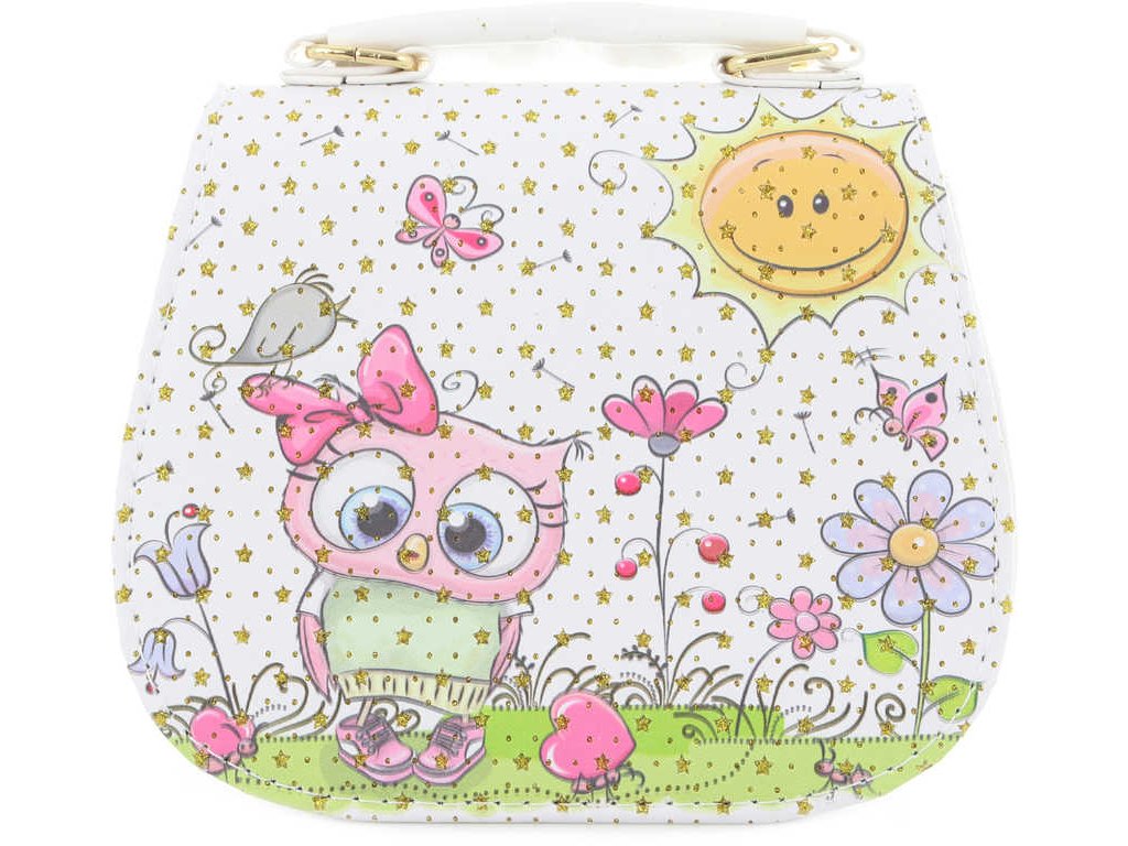Bílá třpytivá kabelka s obrázkem, se sovičkou, s rukojetí, pokrytá blyštivými hvězdičkami, pro všechny malé parádnice.