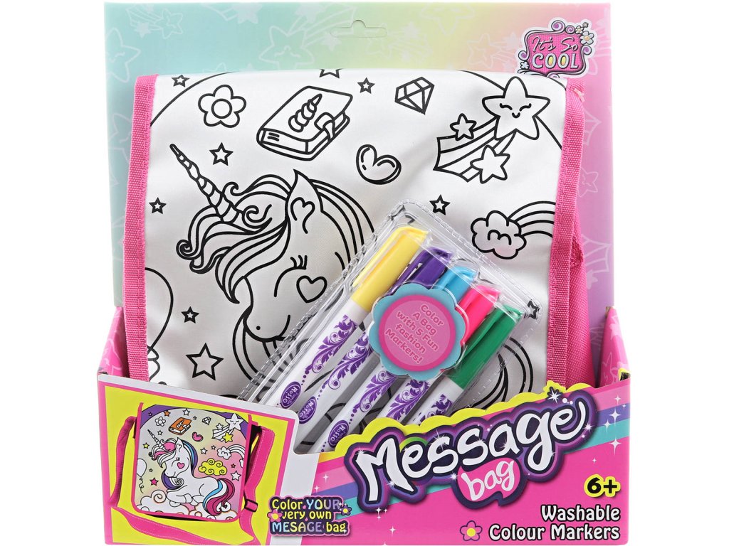 Vybarvovací pratelná kabelka s motivem Jednorožec. Malovací kabelka má zapínání na suchý zip a růžový popruh. Součástí 5 fixů. Lze vyprat a malovat znovu.