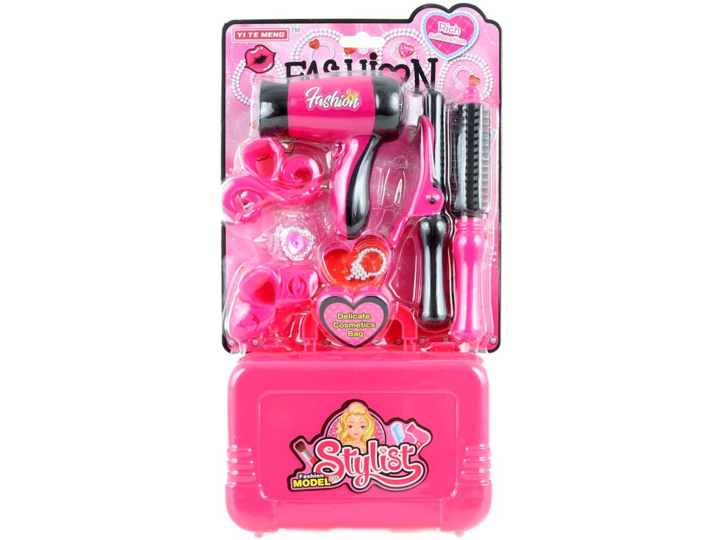 Plastový kadeřnický herní set "Malá kadeřnice". Součástí fén, kulma, náušnice, hřeben, zrcátko ... a kufřík o velikosti 19 x 14 x 5,5cm.