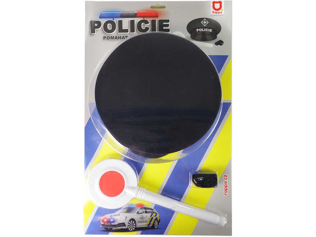 Nasaď si čepici, popadni dopravní terčík, zapískej na píšťalku a vzhůru do ulic pomáhat a chránit! Sada obsahuje policejní čepici s nápisem Policie, plácačku a píšťalku.