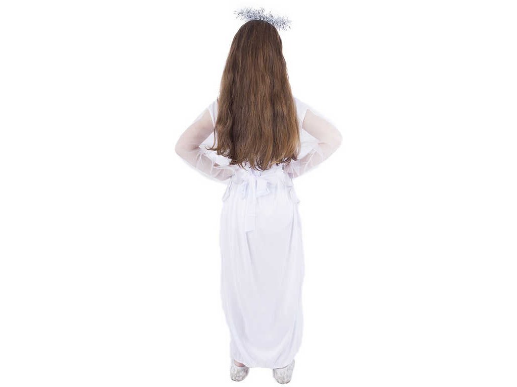 Půvabný karnevalový kostým s motivem anděla ve stříbrno-bílé barvě a velikosti M je určen pro holčičky ve věkovém rozmezí 4-6 let (110-116 cm).