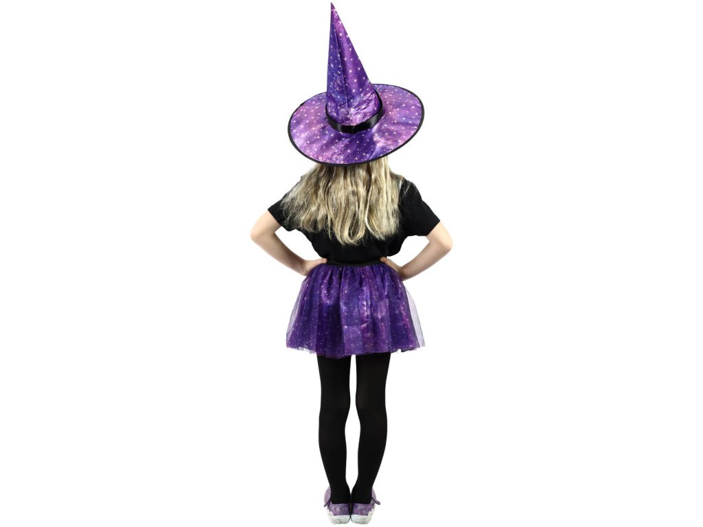 Magický kostýmek fialové barvy zdobený dekorem hvězdiček je určen pro holčičky ve věkovém rozmezí 3-7 let. Balení obsahuje nadýchanou sukničku a k tomu perfektně sladěný špičatý klobouk. Sukně je v pase na gumičku. Vhodné i na halloween.