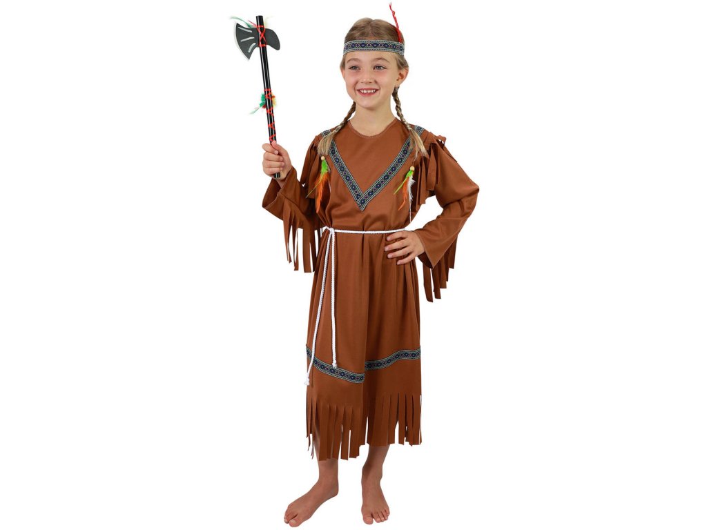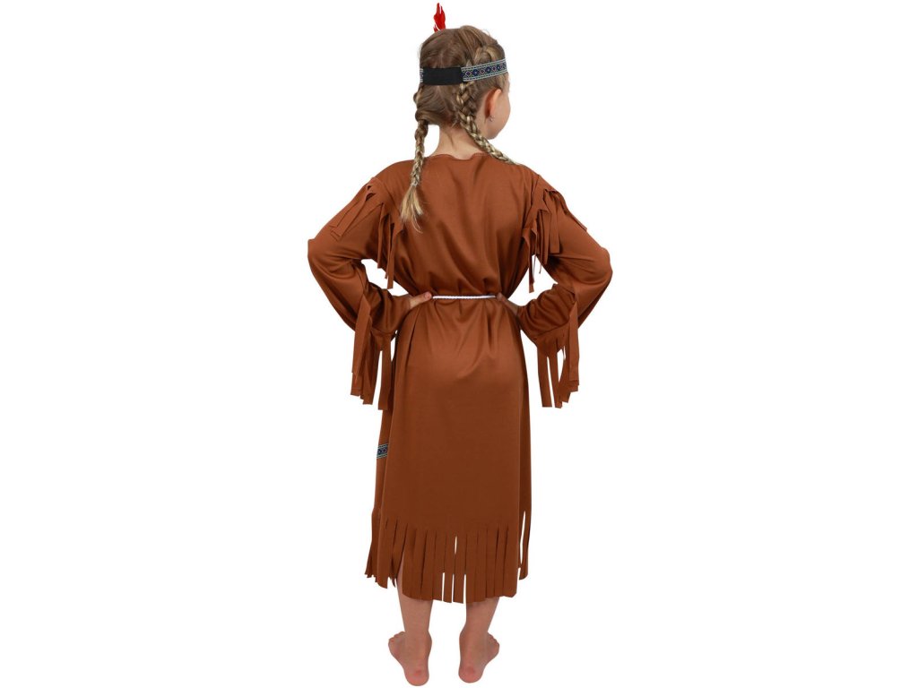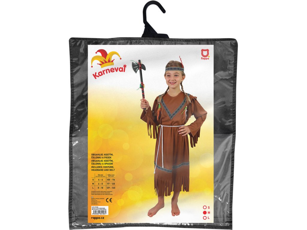 Stylový karnevalový kostým v motivu indiánské slečny! Kostým hnědé barvy ve velikosti M je určen pro děvčata ve věkovém rozmezí 6-8 let (117-128 cm). Balení obsahuje šaty s indiánskými vzory, šňůrku sloužící jako opasek a perfektně sladěnou čelenku. Celé šaty jsou navíc zdobeny střapci.