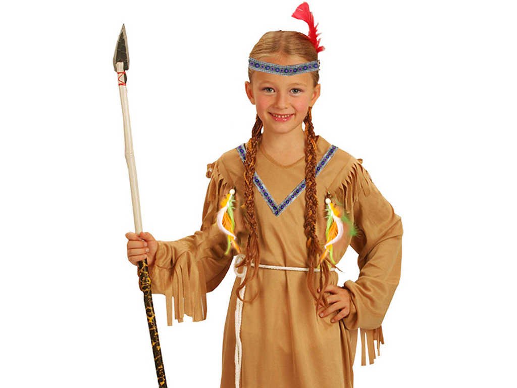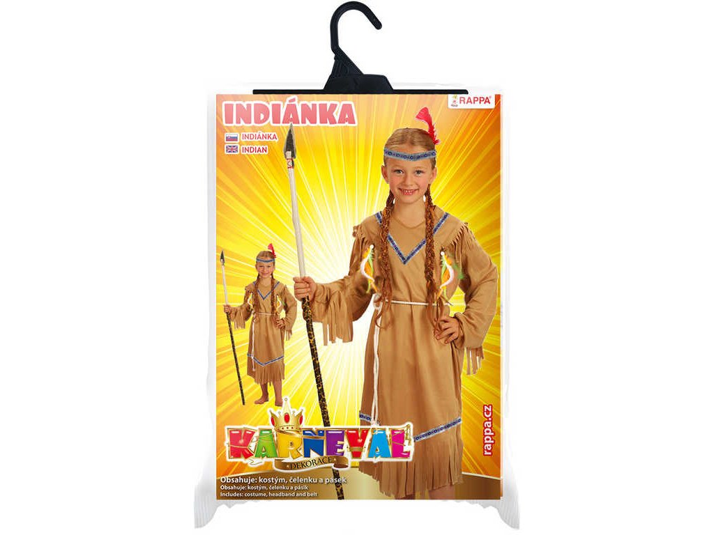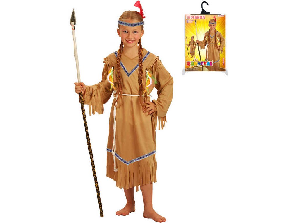 Stylový karnevalový kostým v motivu indiánské slečny! Kostým hnědé barvy je určen pro děvčata. Balení obsahuje šaty s indiánskými vzory, šňůrku sloužící