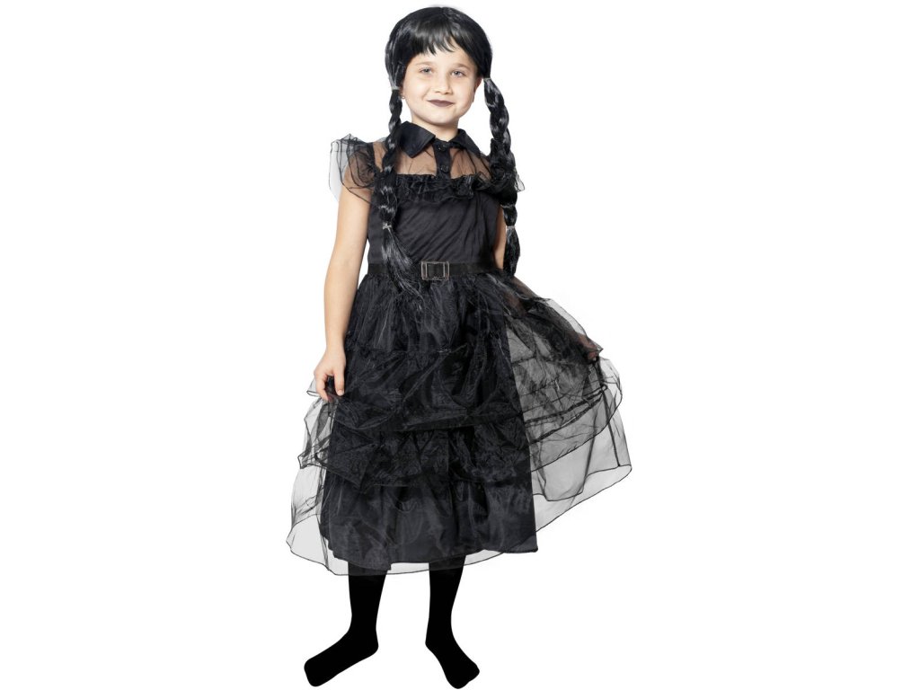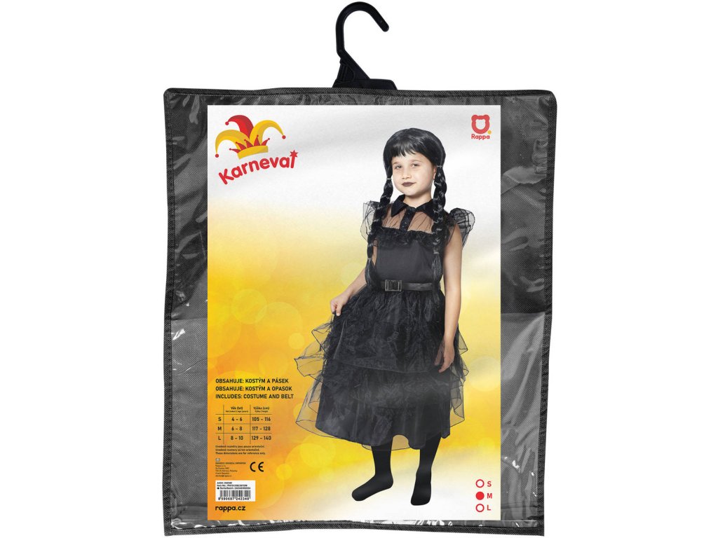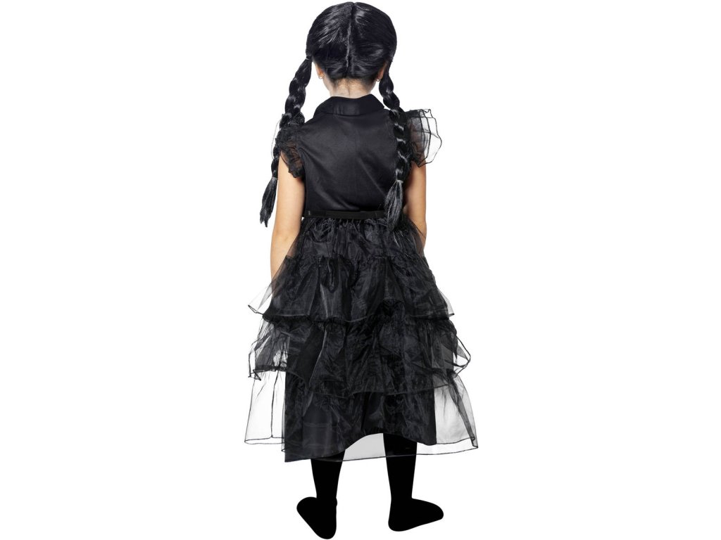 Vnes trochu tajemna mezi své kamarády s tímto skvělým kostýmem, který je ideální pro všechny fanynky temného nadpřirozena. Černé gotické šaty s volány zdobí opasek se sponou. Doporučujeme kombinovat s černou parukou spletenou do copů a tmavými očními stíny. Kostým velikosti M je určen pro děvčata ve věkovém rozmezí 6 - 8 let (117 - 128 cm). Paruka není součástí balení.