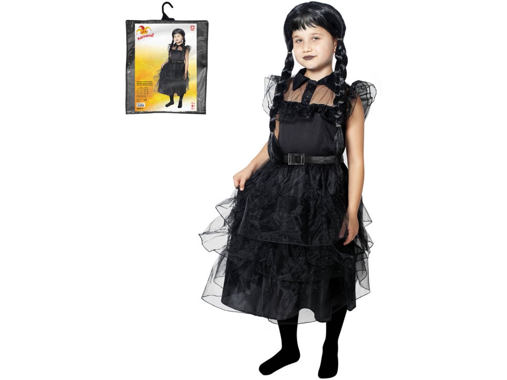 Černý karnevalový kostým šaty Tajemná dívka ("Wednesday"), velikost M, pro výšku postavy 117-128cm, věk 6-8 let.