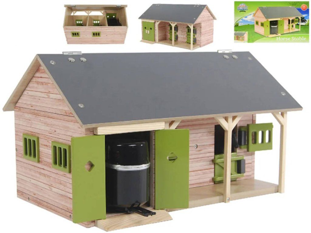 Koňská stáj Kids Globe se 2 boxy pro koně a úložným prostorem. Střechu lze otevřít pomocí výklopné části, která umožňuje přístup do úložného prostoru. Boxy i úložná část mají zelené dveře, které lze otevírat a zavírat, a zelená okna s mřížemi. Stáj je vyrobena z pevného dřeva. Stáj je ideální pro koně Schleich. Příslušenství není součástí balení. Vyžaduje montáž.