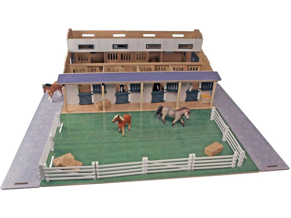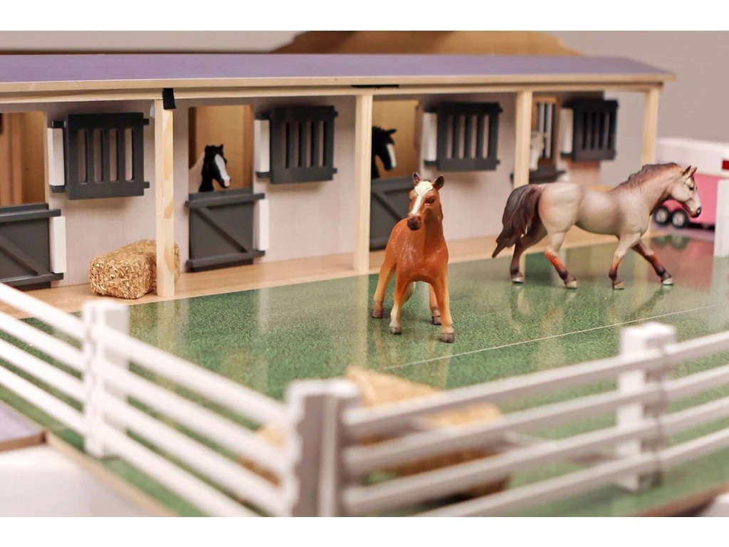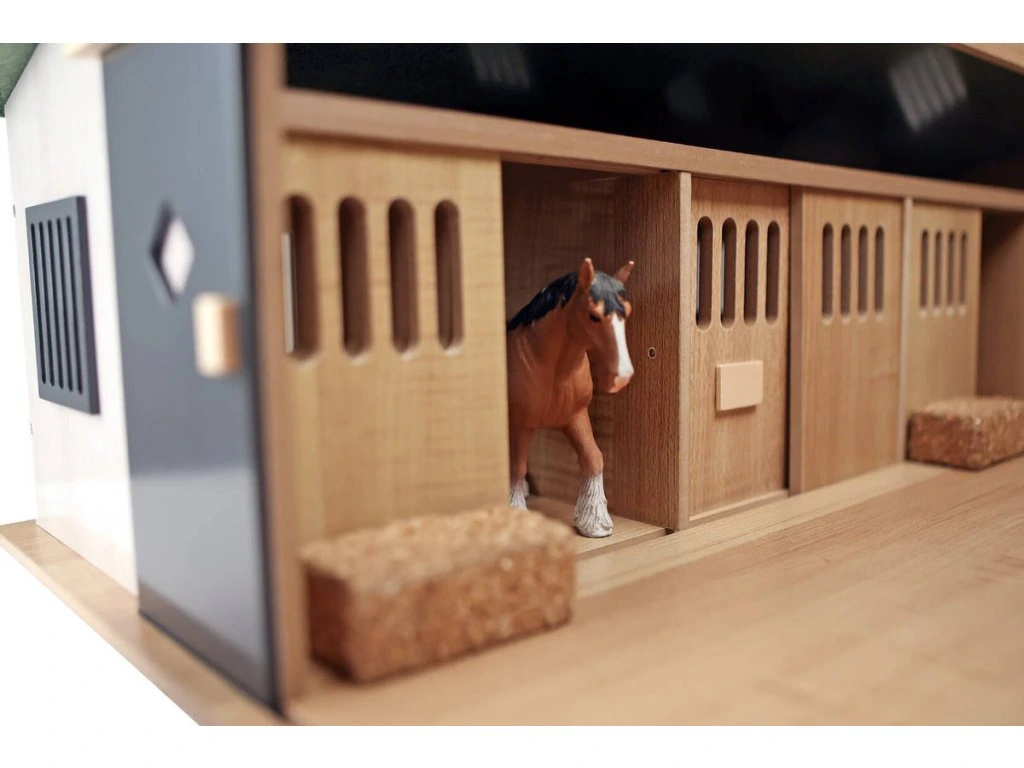 Velká dřevěná stáj je vyrobena kompletně ze dřeva a materiálů na bázi dřeva. Uvnitř se nachází chodba, celkem 7 boxů pro koně a také hospodářská místnost. Stáj působí velmi realisticky – má odnímatelné oboustranné střešní panely, které lze umístit vedle stodoly a vytvořit tak pastvinu nebo imitaci betonových ploch pro jízdu s hračkovými traktory či jinými vozidly. Skvěle se hodí k figurkám koní ve stejné měřítku nebo o velikosti cca 10–12 cm.