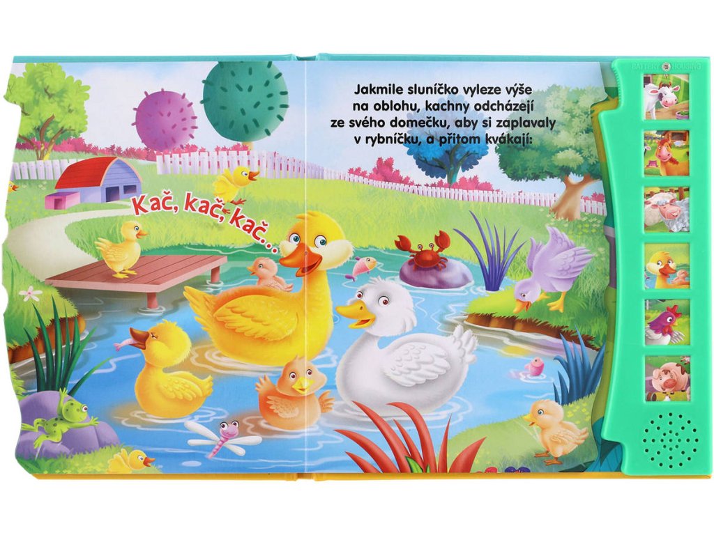 Zmáčkněte, prohlížejte obrázky a poslouchejte! Knížka seznámí děti se zvířátky, která žijí na farmě. Stisknou tlačítko a mohou si poslechnout, jak kravička, kůň, slepice, prasátko a další zvířátka.