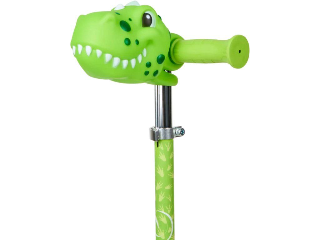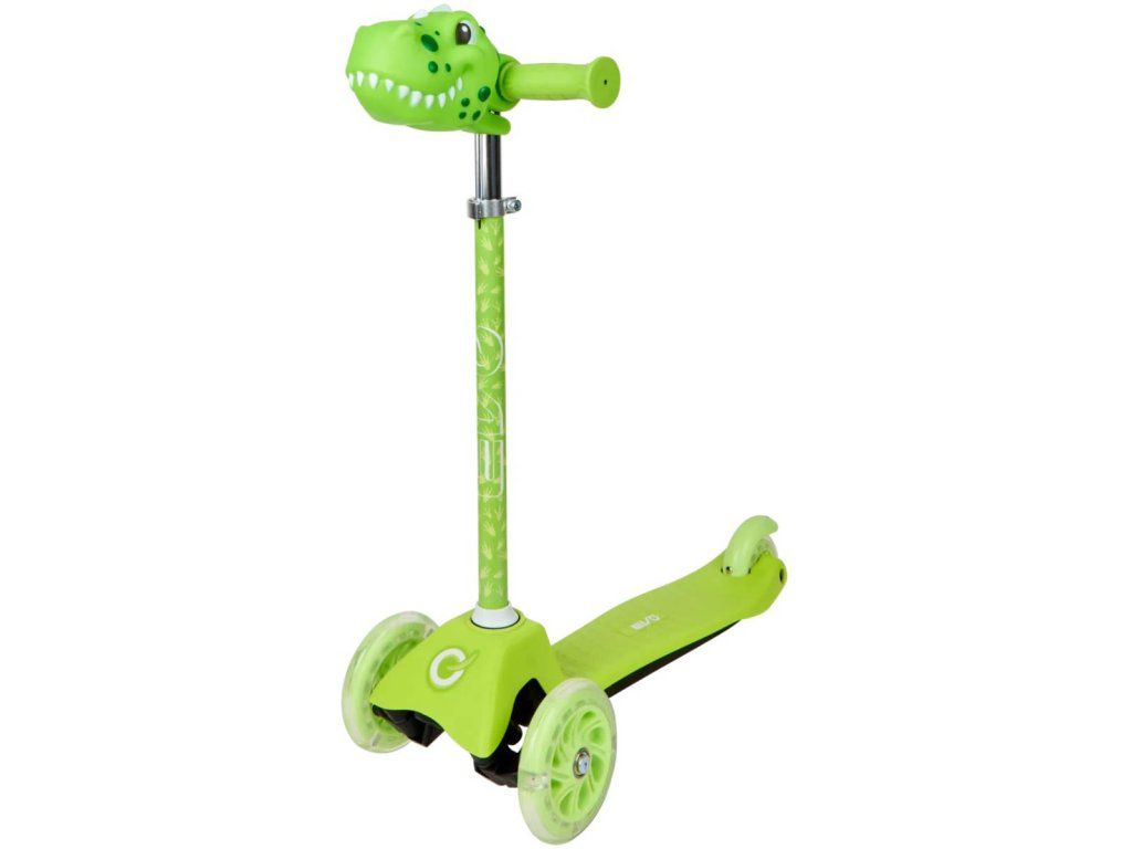 Dětská zelená koloběžka s hlavičkou dinosaura na řídítkách, velikost 53 x 72 x 25cm, svítící LED kolečka, max. nosnost: 50kg, vhodná i pro menší děti. Hračka na baterie, se světlem.