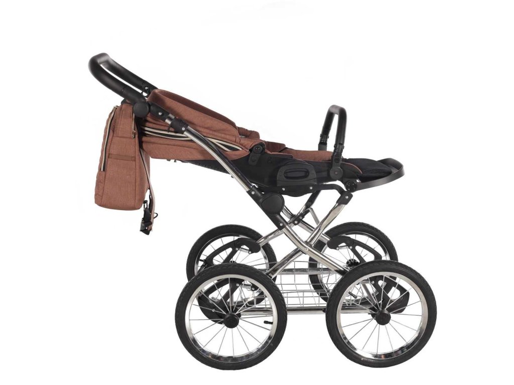 Náš houpací retro kočárek má velké nafukovací kola (14 palců) s ložisky. Je opatřen nášlapnou brzdou pro dokonalé zabrždění.