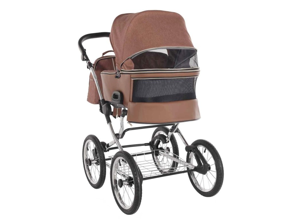 Koženková taštička pod kočárkem je vhodná pro drobné věci nebo pro pumpičku na dofouknutí kol. Velký, drátěný košík pod kočárkem zvládne opravdu objemný nákup.