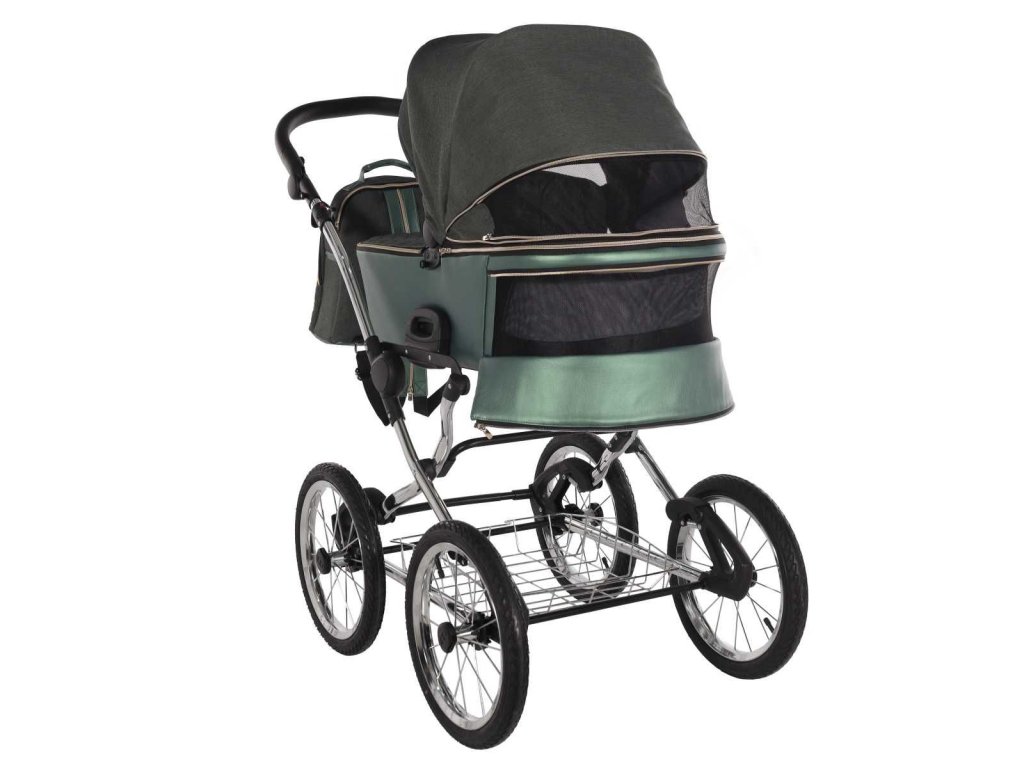 Náš houpací retro kočárek má velké nafukovací kola (14 palců) s ložisky. Je opatřen nášlapnou brzdou pro dokonalé zabrždění.