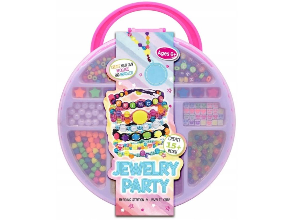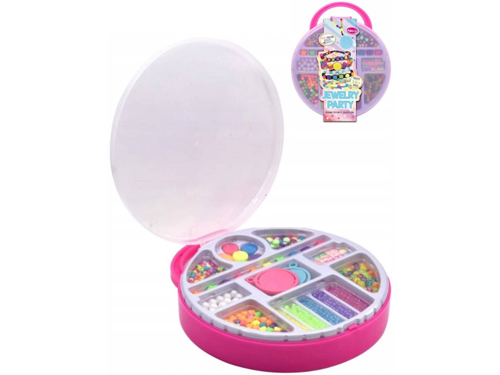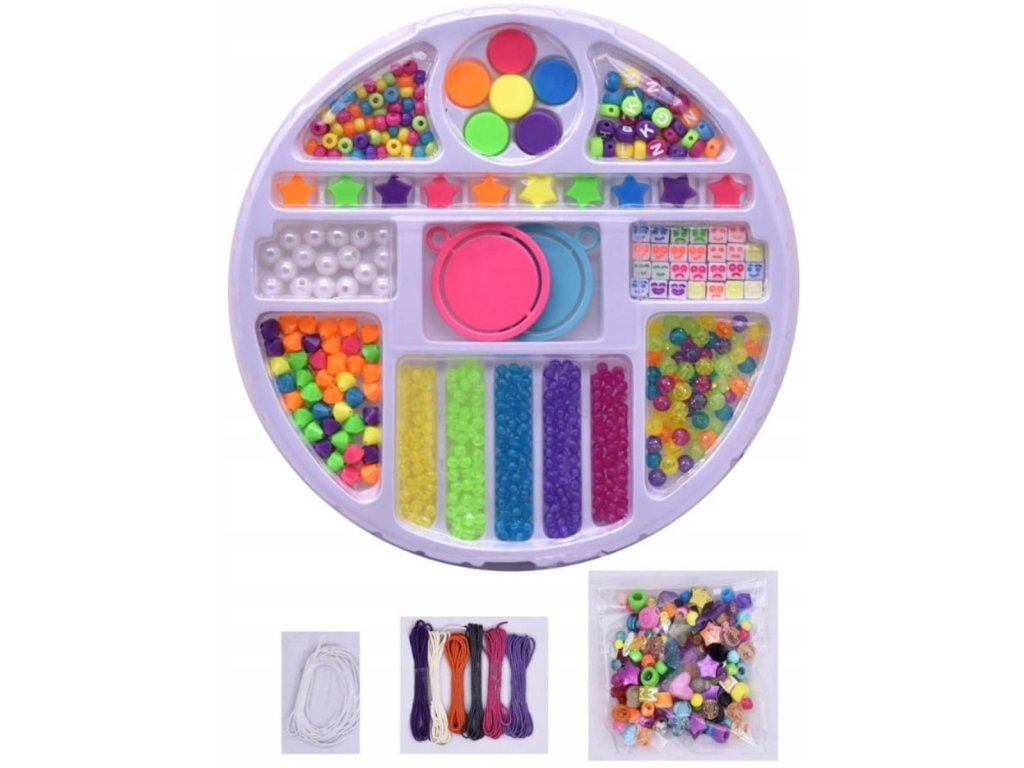 Sada korálků na výrobu vlastních náramků a náhrdelníků. Sada obsahuje korálky různých barev a tvarů, šňůrku. Praktické balení kulatého kufříku s uchem a dělenými přihrádkami na korálky. Vhodné pro děti od 6ti let.