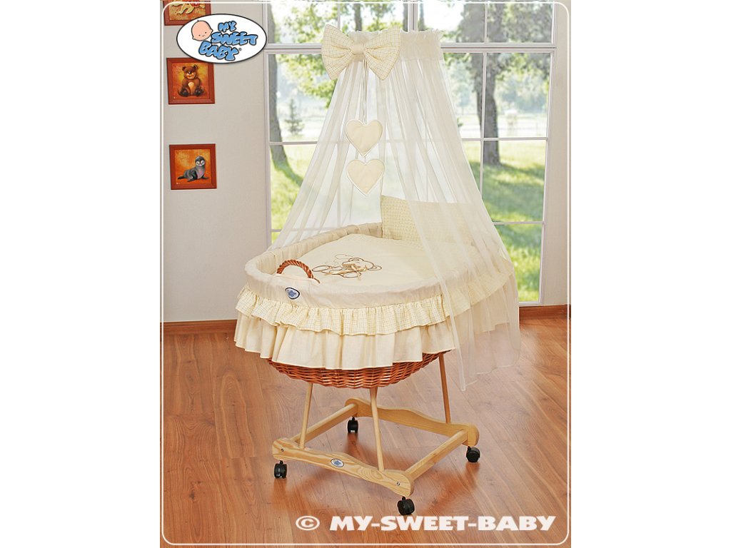 9) dřevěný podvozek je stabilní, pevný a dole má 4 kolečka, zajišťující snadný pohyb koše z pokoje do pokoje. Dva přední kolečka jsou s brzdou, zajišťují větší bezpečnost dítěte.
