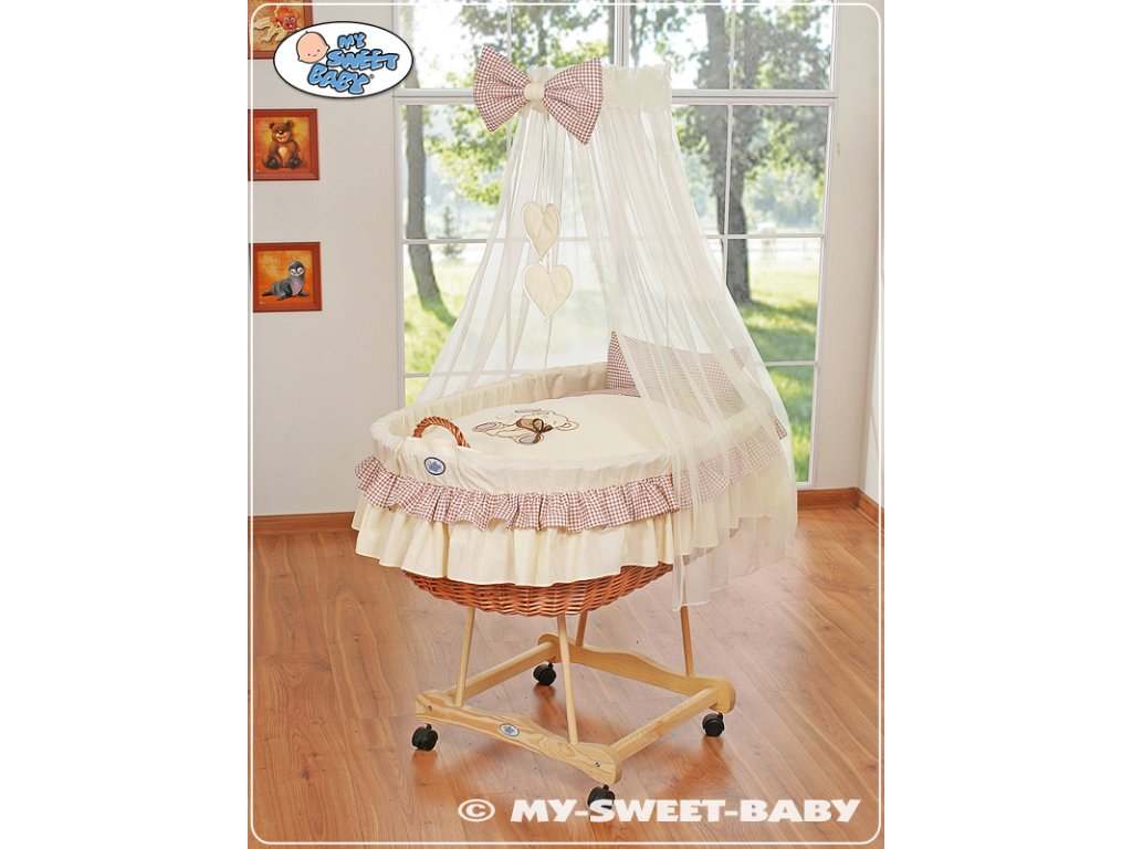 9) dřevěný podvozek je stabilní, pevný a dole má 4 kolečka, zajišťující snadný pohyb koše z pokoje do pokoje. Dva přední kolečka jsou s brzdou, zajišťují větší bezpečnost dítěte.