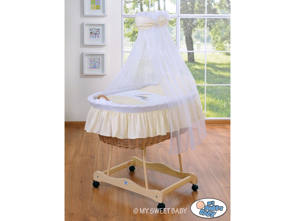 9) dřevěný podvozek je stabilní, pevný a dole má 4 kolečka, zajišťující snadný pohyb koše z pokoje do pokoje. Dva přední kolečka jsou s brzdou, zajišťují větší bezpečnost dítěte.
