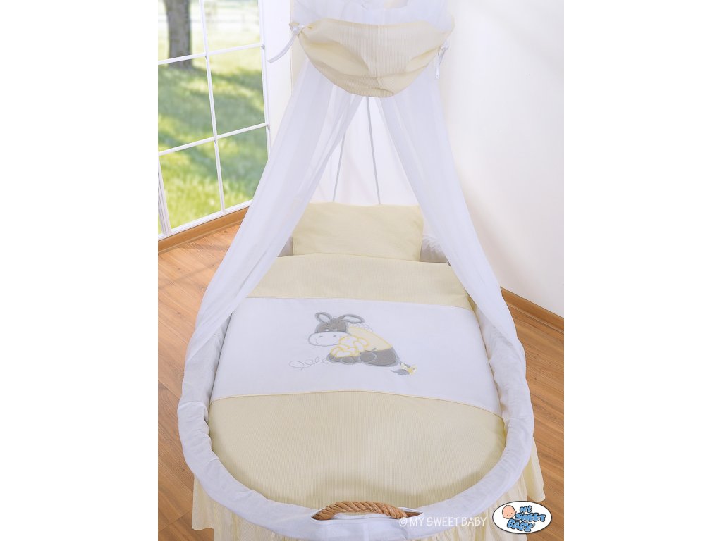 1) proutěný koš ručně vyplétaný ze zdravotně ekologického proutí. Dno koše má rozměr 80 x 45 cm a proto je ho možno užívat až do cca 6 měsíců věku dítěte. Přední úchyt zajišťuje lepší manipulaci s košem a usnadňuje uspávání miminka.
