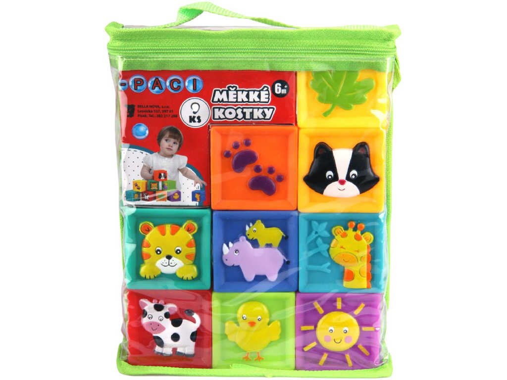 Kostky měkké baby pískací Paci-Paci sada 9ks v igelitové tašce na zip zvířátka