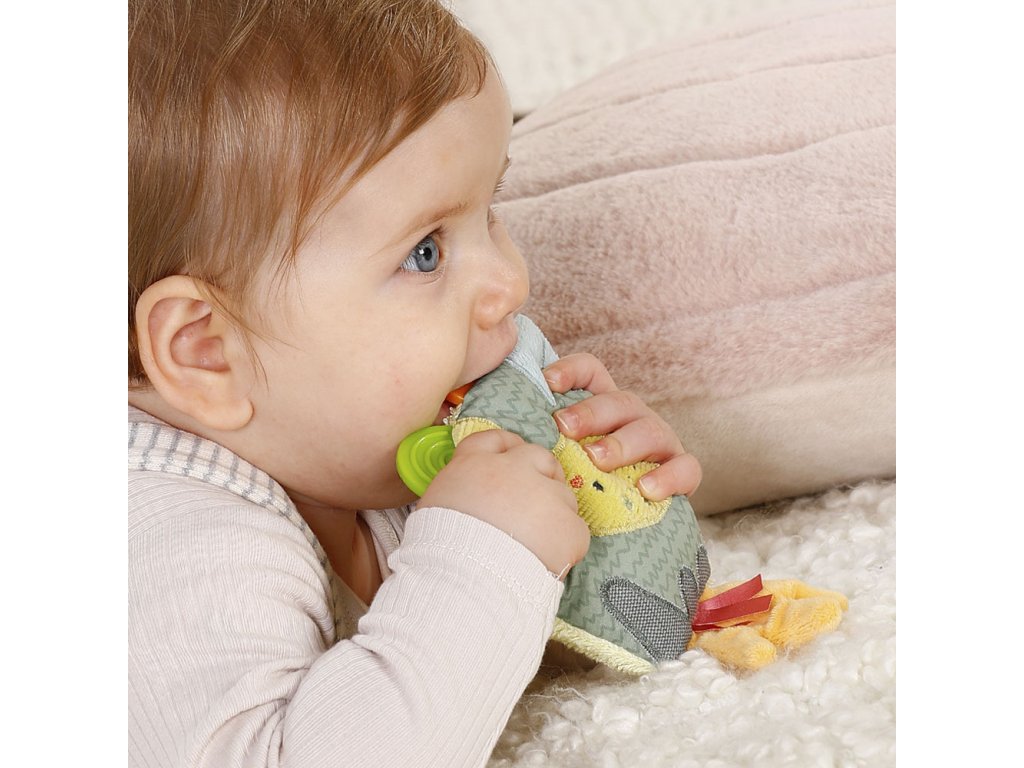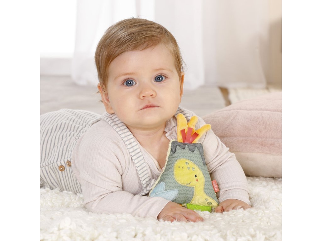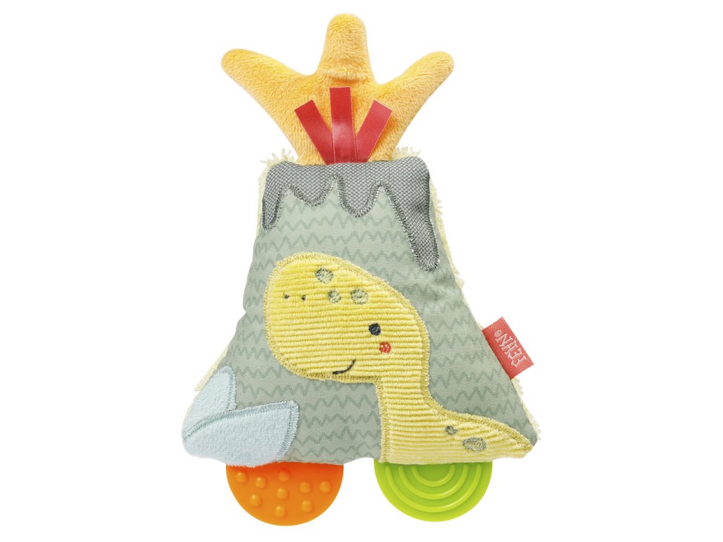 Barevná měkká hračka ve staru sopky umožňuje pohodlné uchopení i malými dětskými ručičkami. Integrované chrastítko a pískátko povzbuzuje děti ke hře. Hračka podporuje hmat a sluch dítěte, stejně jako motorické dovednosti, zatímco pestrobarevný měkký povrch rozvíjí dotek a hmat. Součástí je také měkké kousátko s výstupky a drážkami, které spolehlivě pomáhá s prořezáváním zoubků.