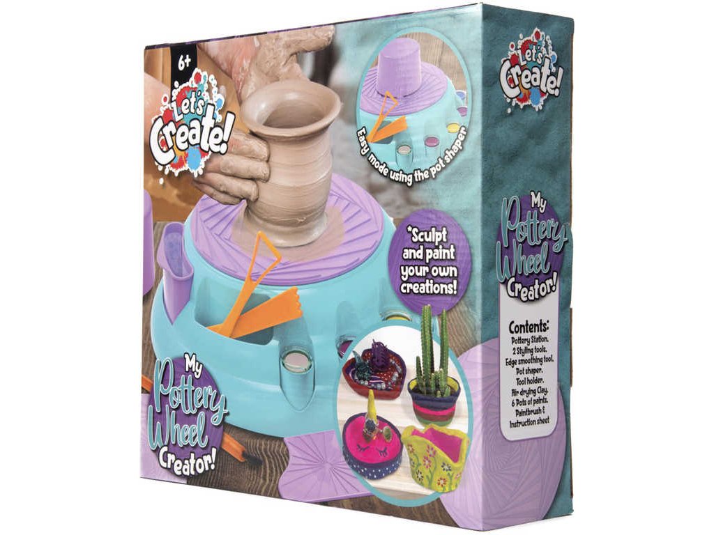 Hrnčířský kruh pro malé výtvarníky. Velmi snadné tvarování nádob. Obsahuje – hrnčířský kruh, 2 nástroje na styling, nástroj pro vyhlazování hran, šablonu na nádobu, držák nástrojů, hlínu schnoucí na vzduchu, 6 různých barev,