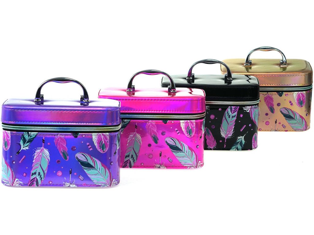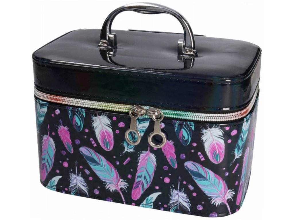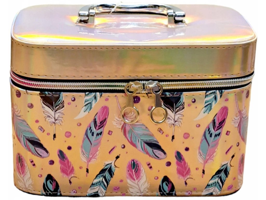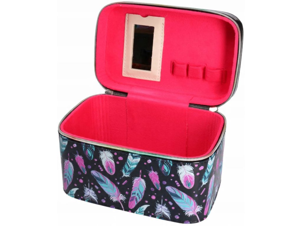 Dětský lepenkový kosmetický kufřík. Lesklý, třpytivý vzhled, s motivem peří, s madlem, zapínání na zip, zrcátko, tvrdý karton + textilní výstelka. 4 barevné varianty. Velikost 21 x 14 x 13cm